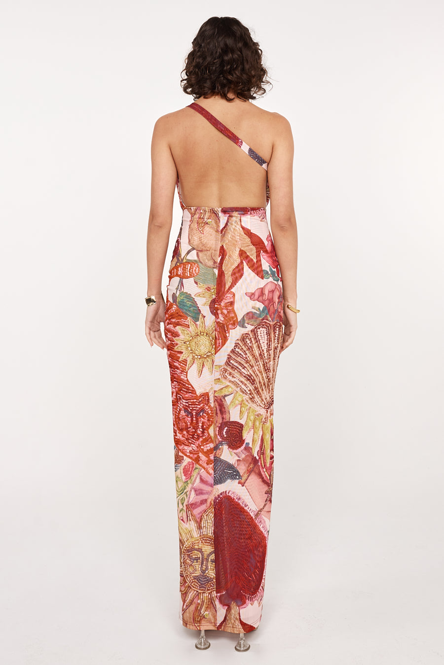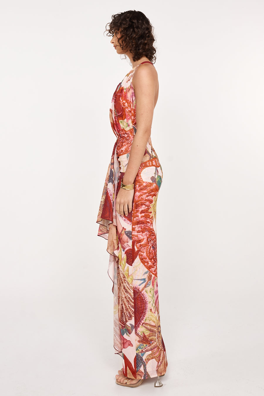 The Amadi Midi Dress in Victor print features striking V-ruching at the waist and a signature front frill, creating a flattering silhouette. Its flashy open back adds a bold touch, making it a standout piece for any occasion