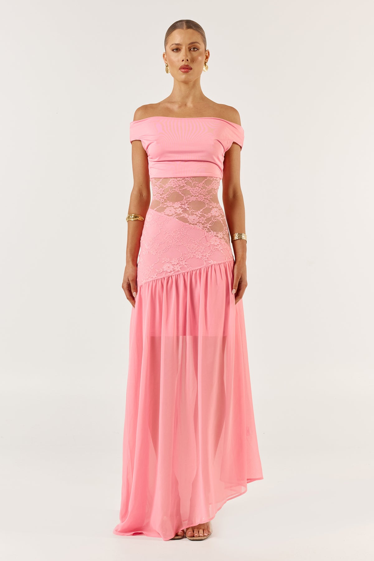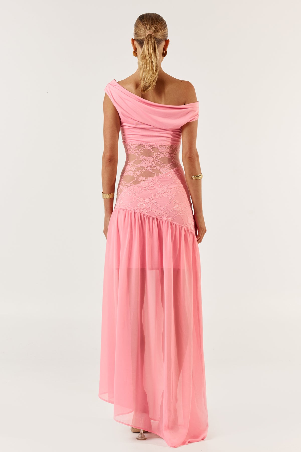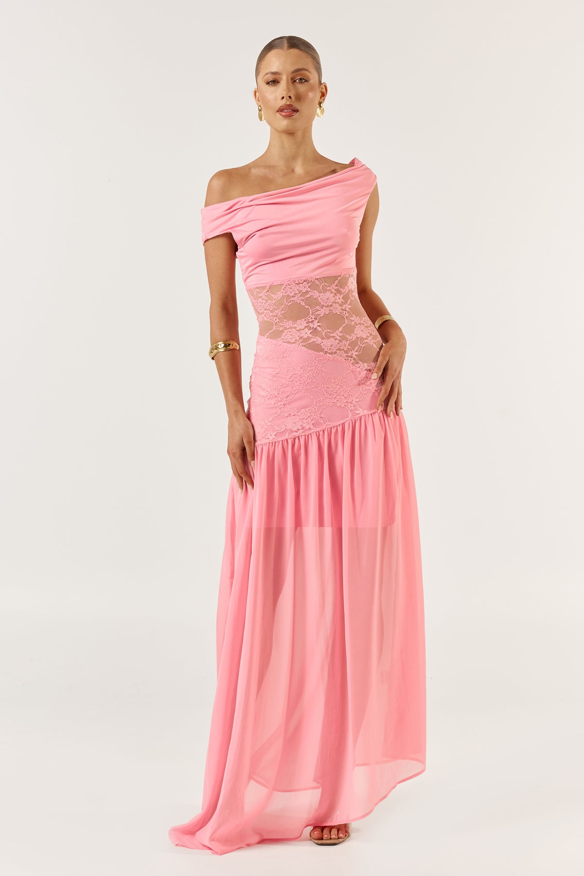 The Capri Maxi in Candy Pink is a chic and versatile dress that beautifully combines stretch lace, georgette, and ITY fabric. It features a stylish design that allows for off-the-shoulder or both-shoulder wear, showcasing elegant design lines that enhance the silhouette. Perfect for a variety of occasions, this dress offers both comfort and sophistication.