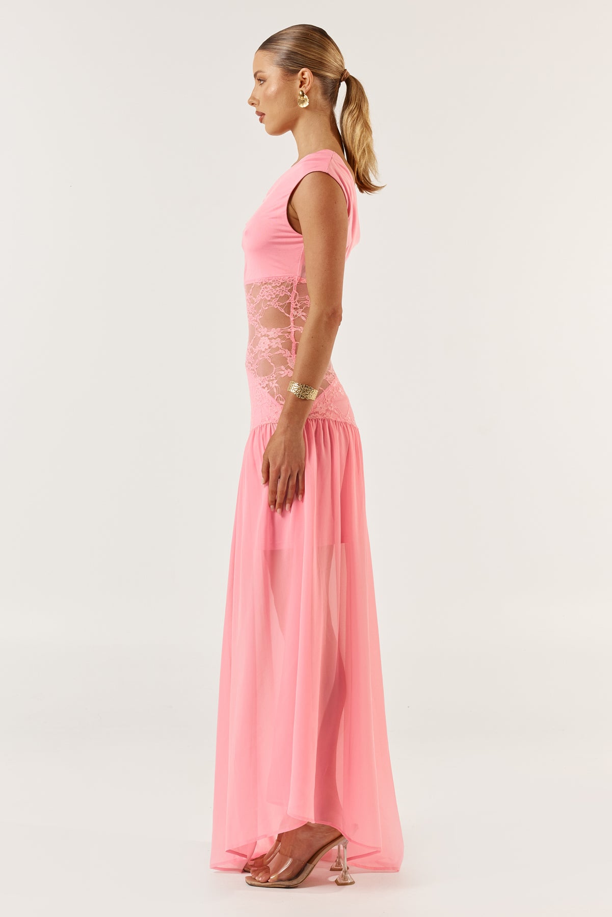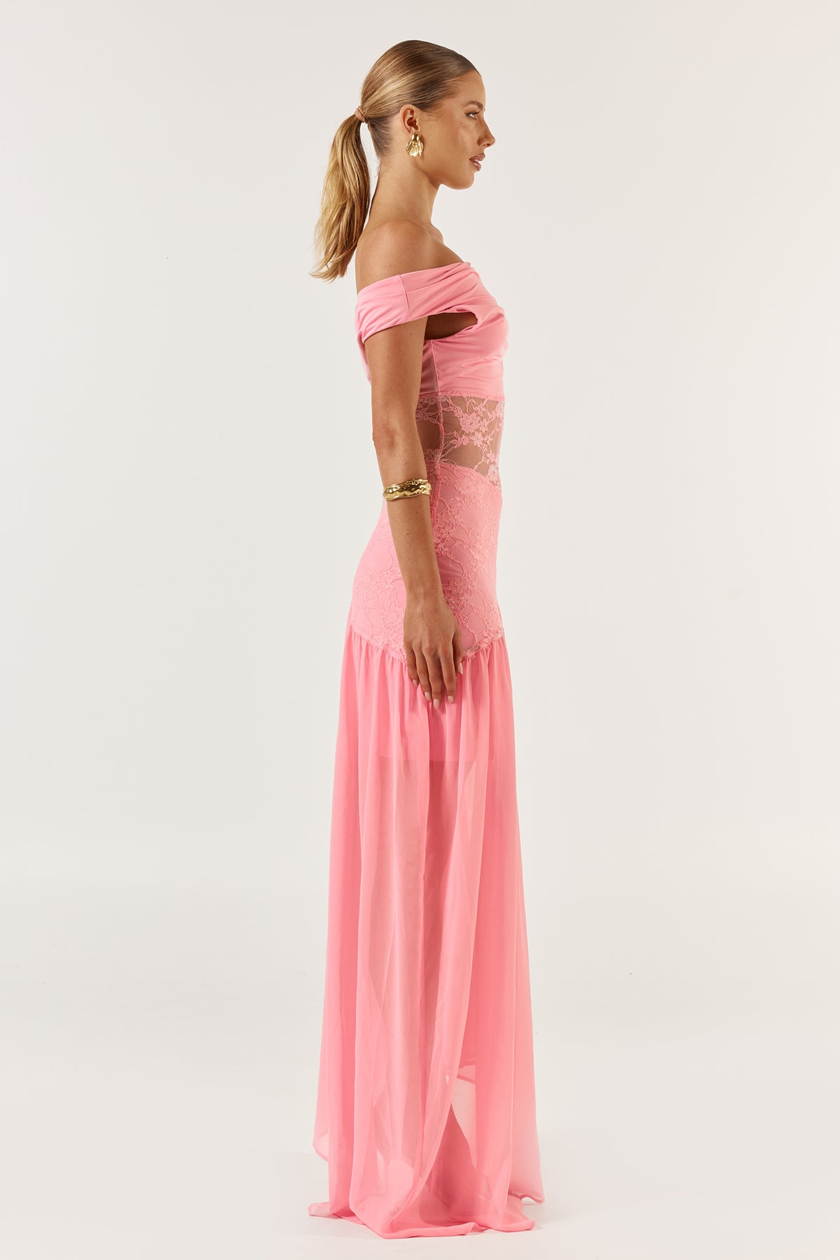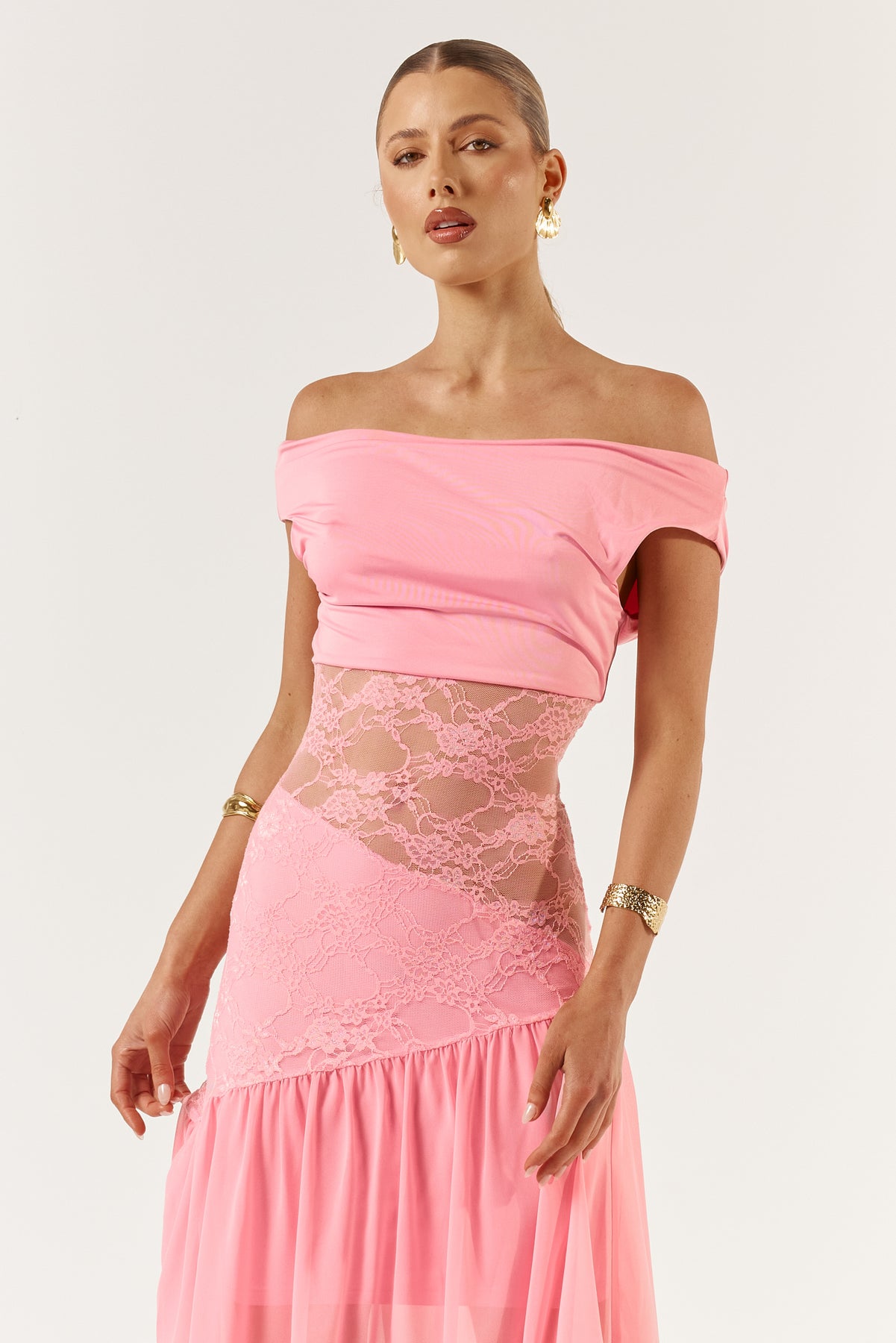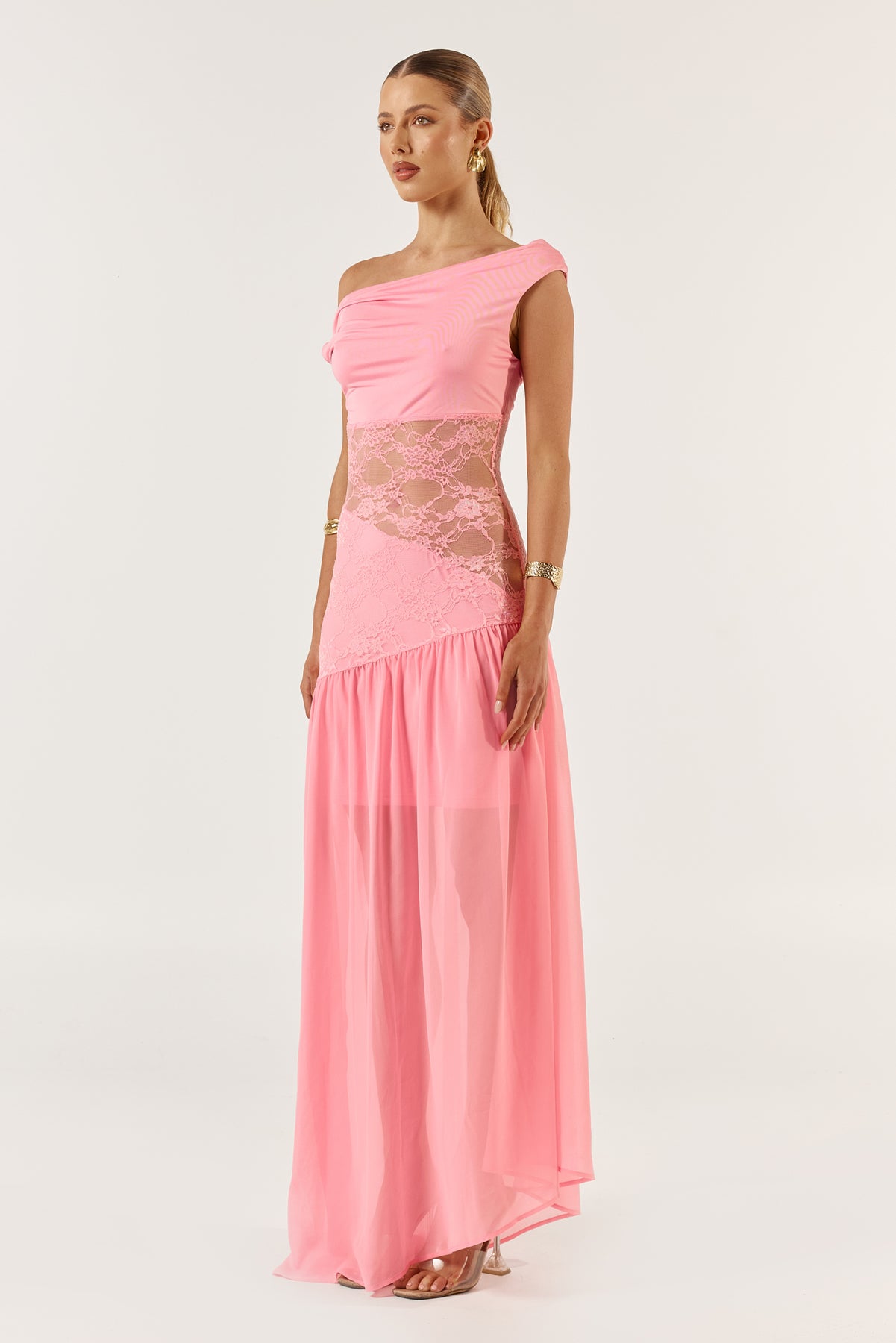 The Capri Maxi in Candy Pink is a chic and versatile dress that beautifully combines stretch lace, georgette, and ITY fabric. It features a stylish design that allows for off-the-shoulder or both-shoulder wear, showcasing elegant design lines that enhance the silhouette. Perfect for a variety of occasions, this dress offers both comfort and sophistication.