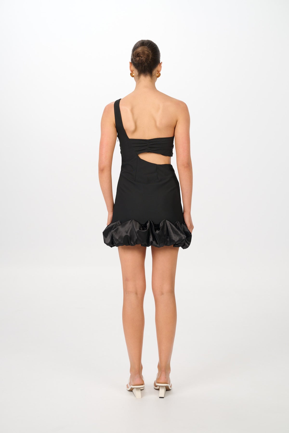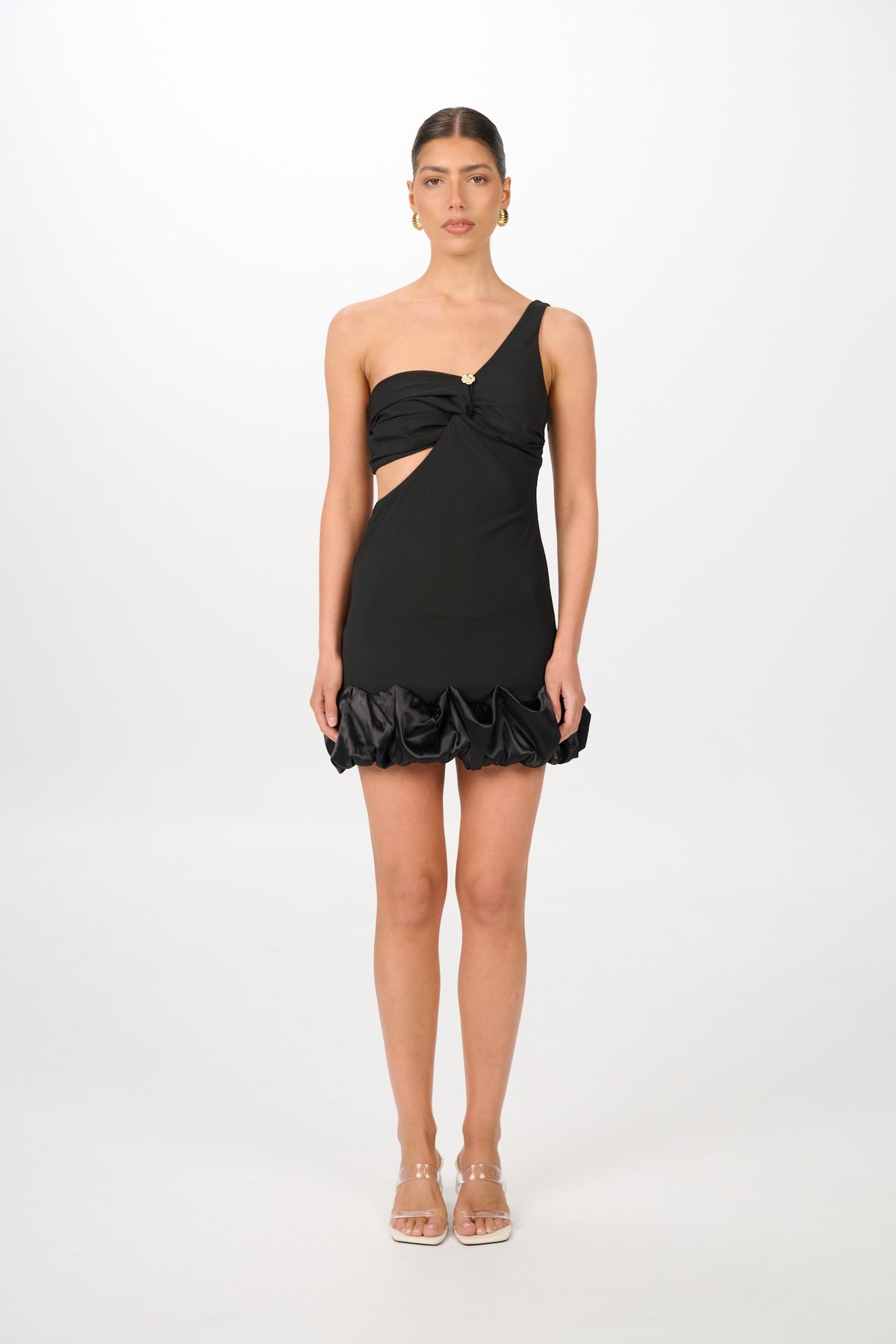 The Elodie Mini Dress in black charms with a small rosette detail at the chest and a delightful silky ruffle at the hem. This dress exudes elegance and playfulness, making it a versatile addition to any wardrobe.
