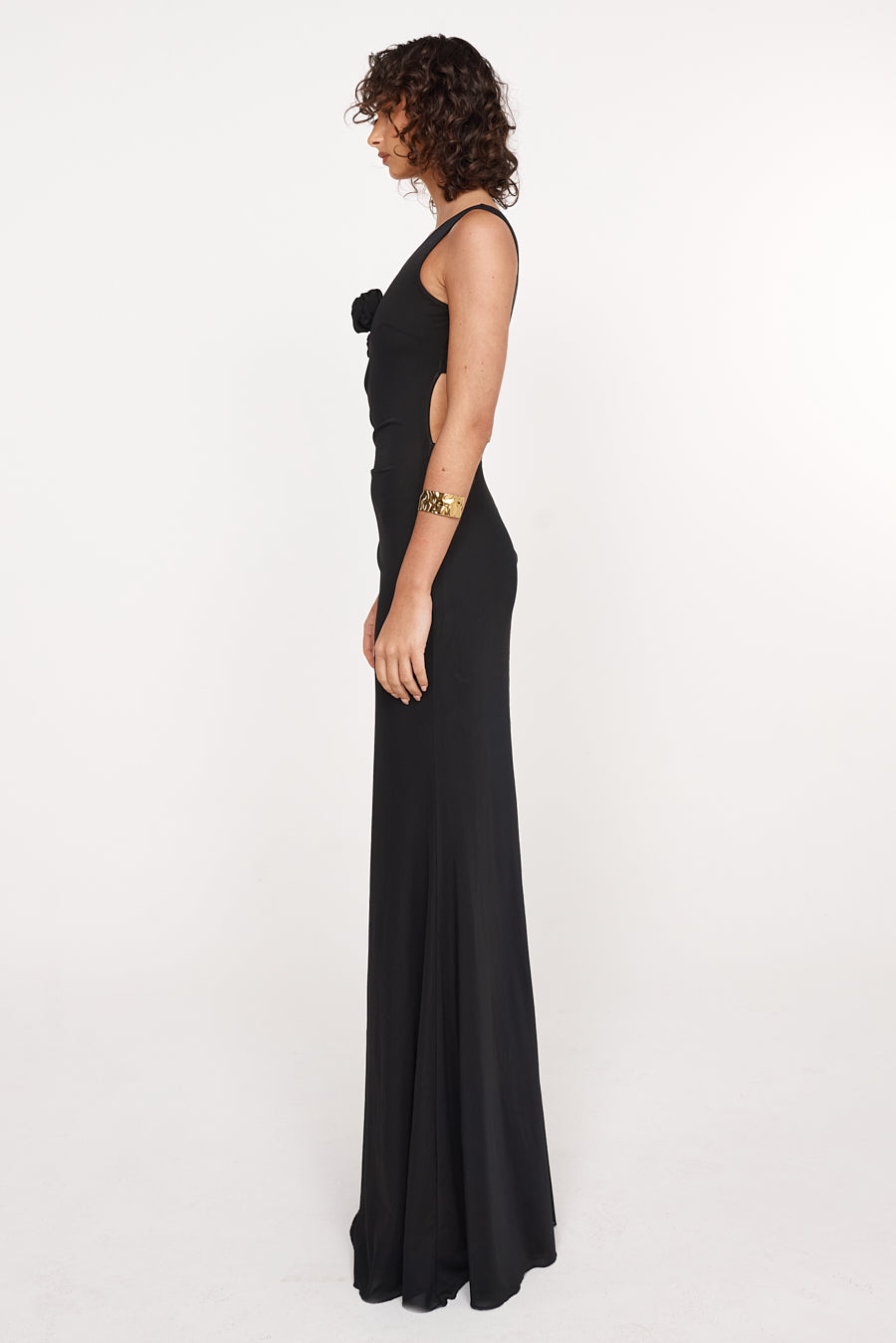 The Sabine Maxi Dress in black showcases two simplistic small roses, elegantly placed on the chest and hip. This understated yet sophisticated design adds a touch of charm to the classic black dress.
