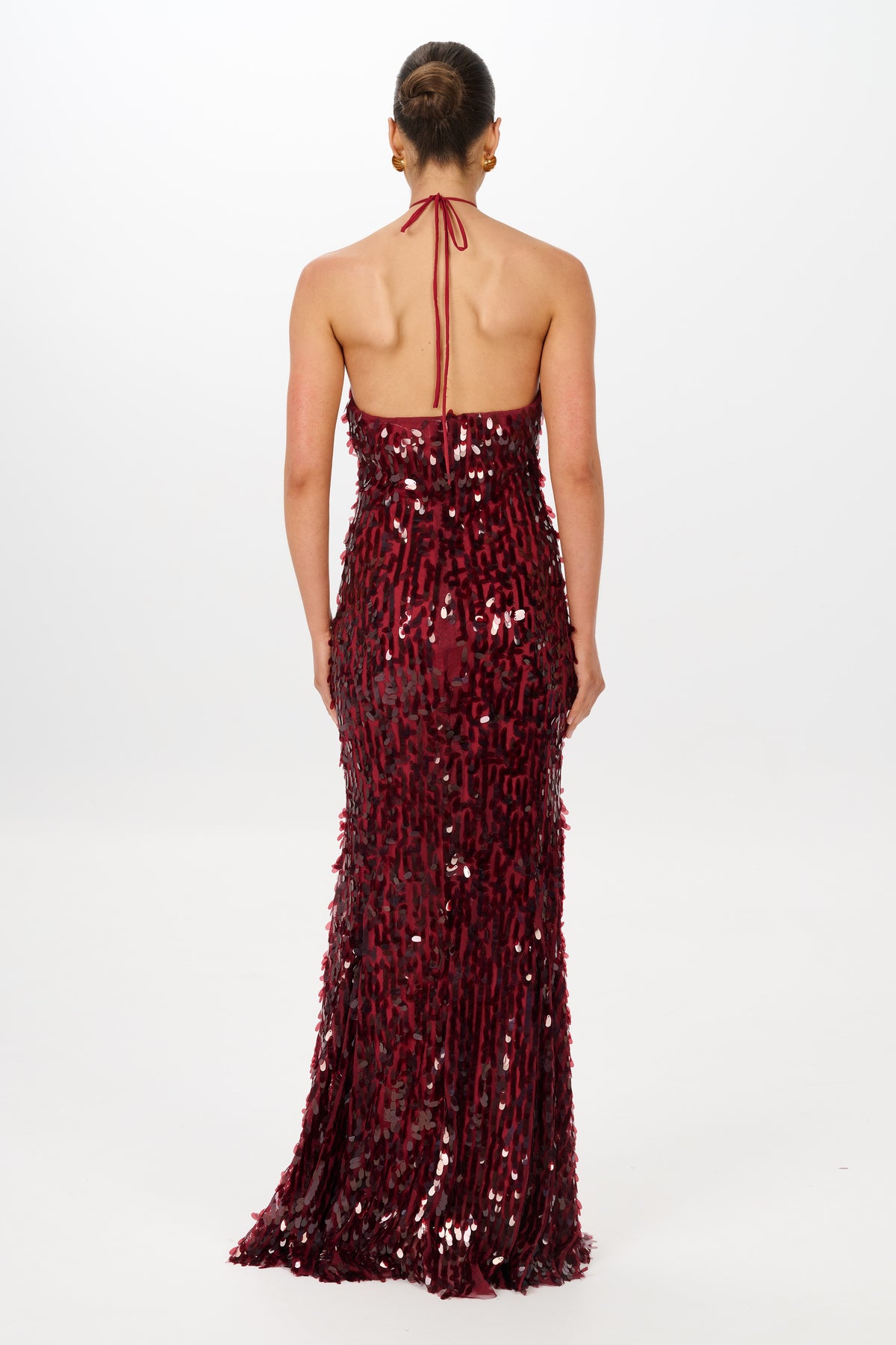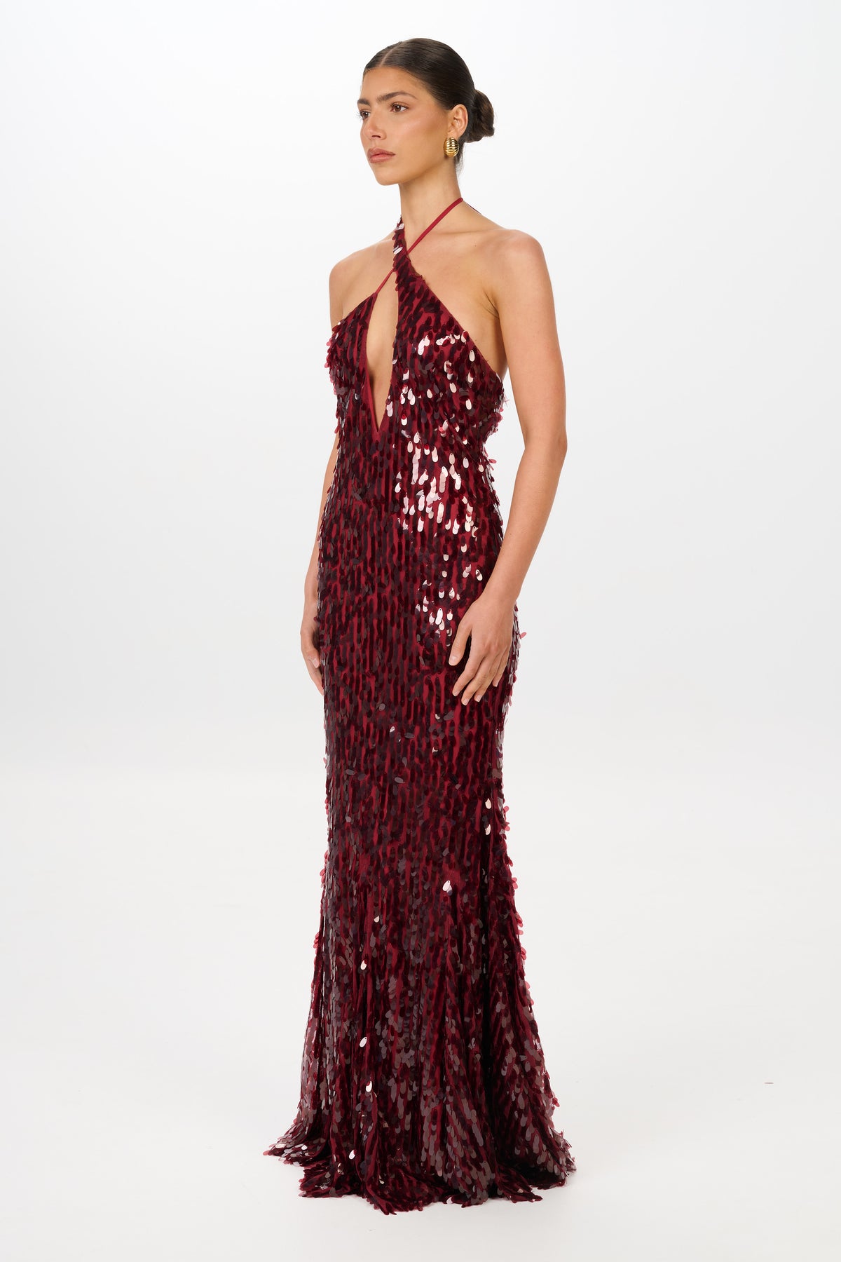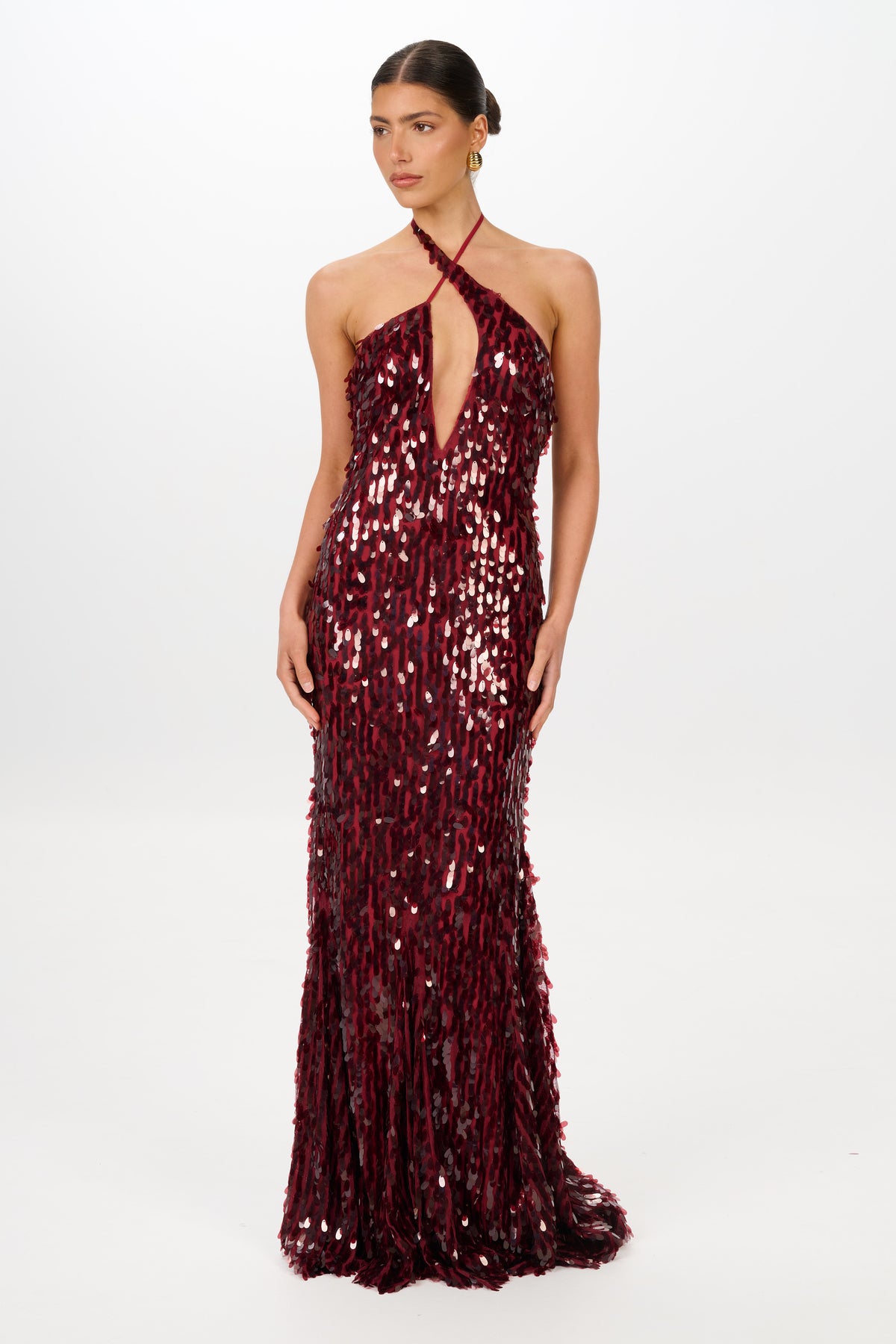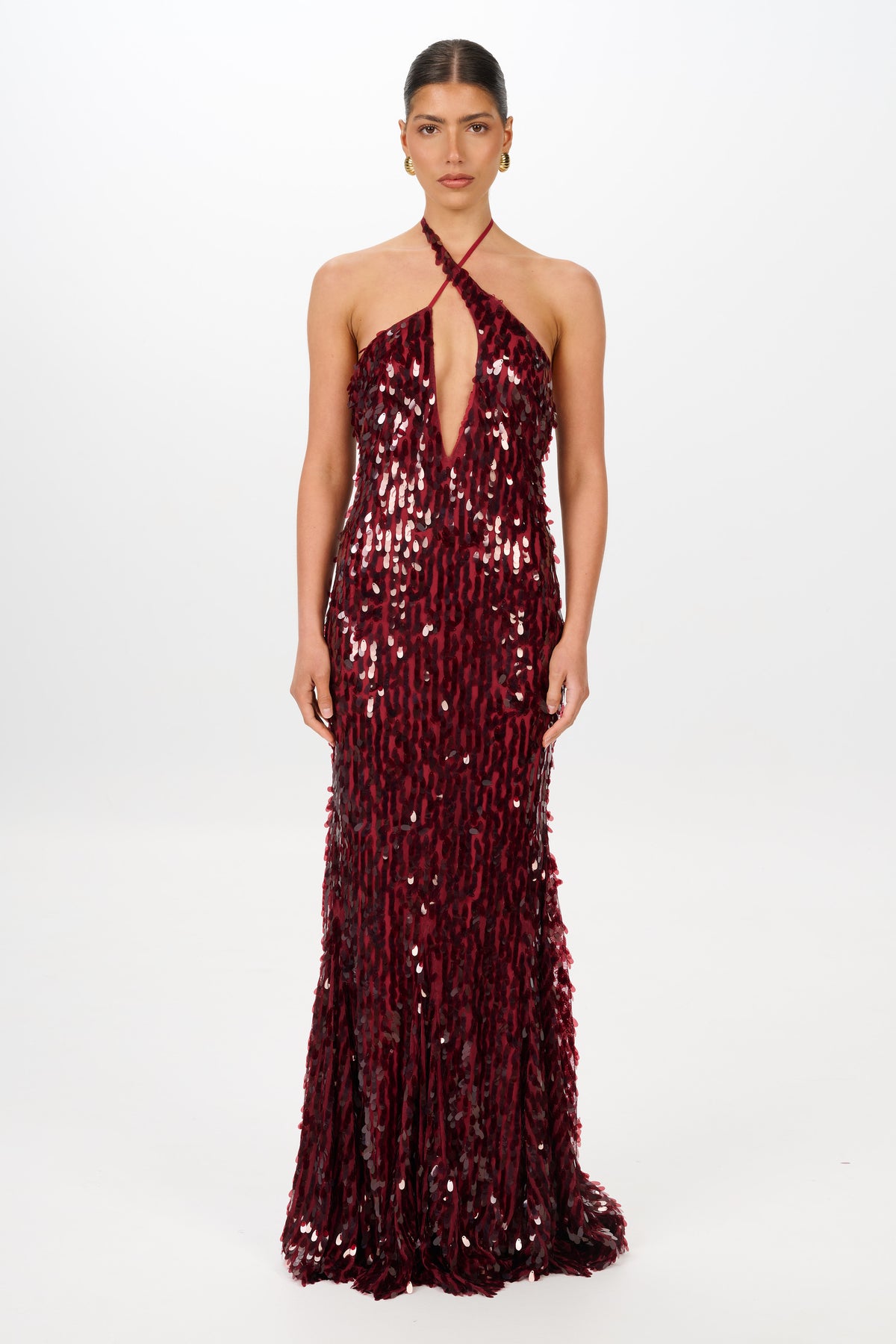The Elara Gown is crafted from deep garnet sequins that shimmer with movement, cut in a silhouette that merges sensuality and sophistication. A halter neckline crosses into a plunging keyhole front, balancing modern edge with timeless glamour. The gown’s sculpted shape falls to a soft floor-length finish, designed to elongate the figure with every step.