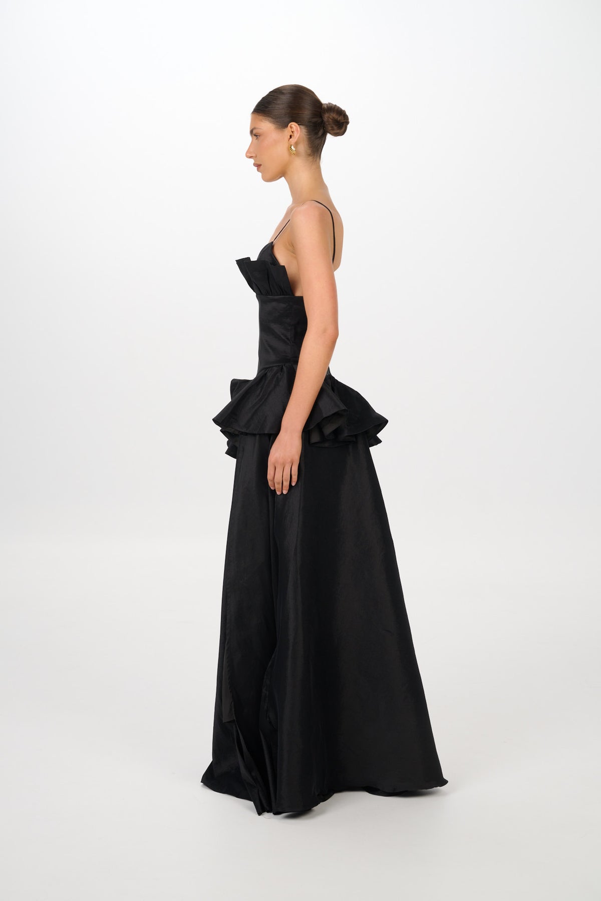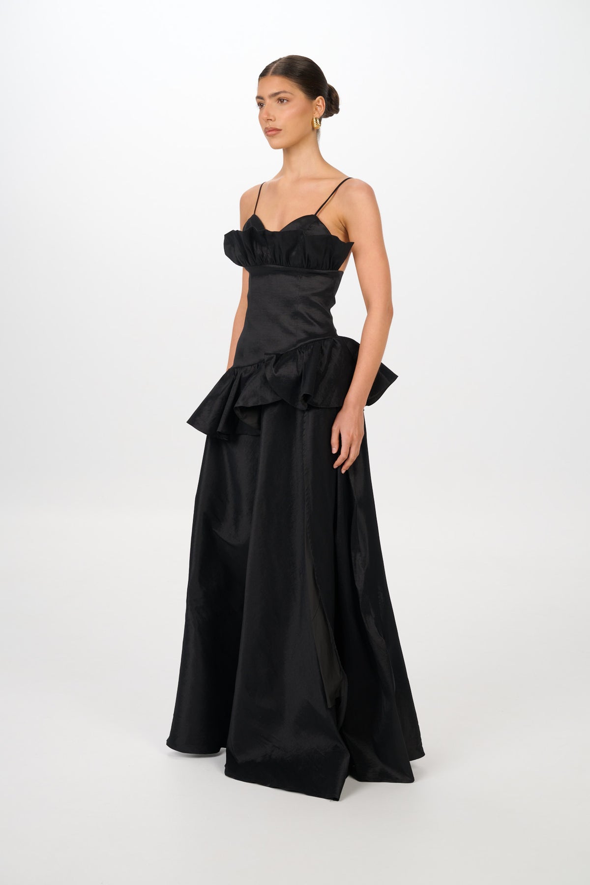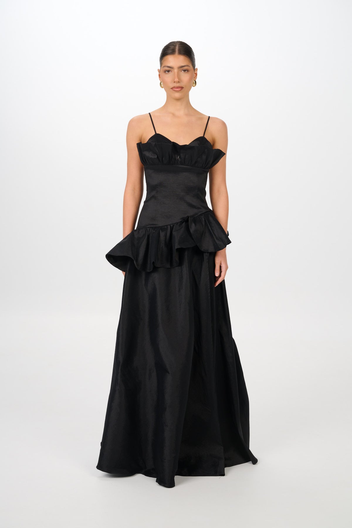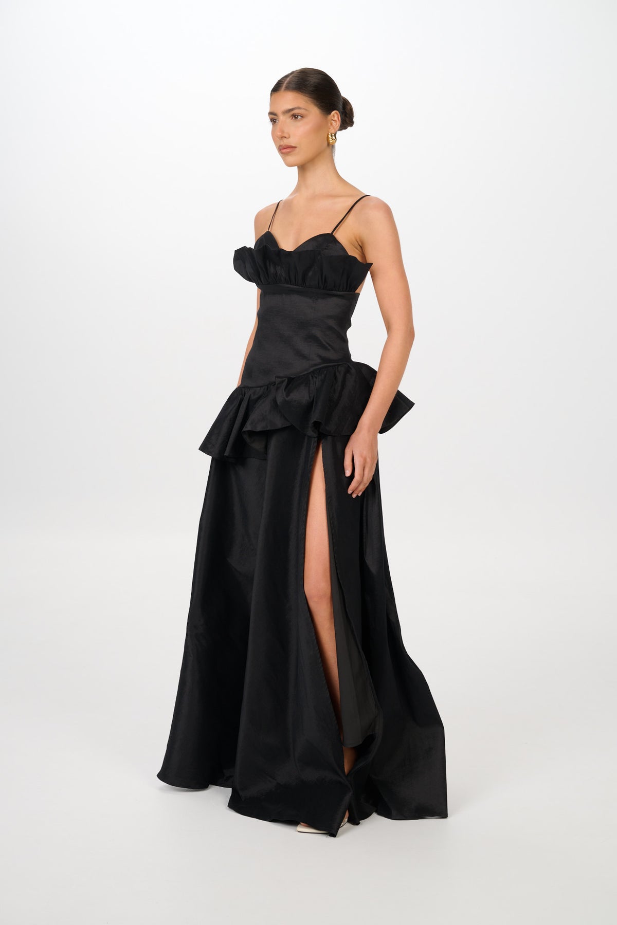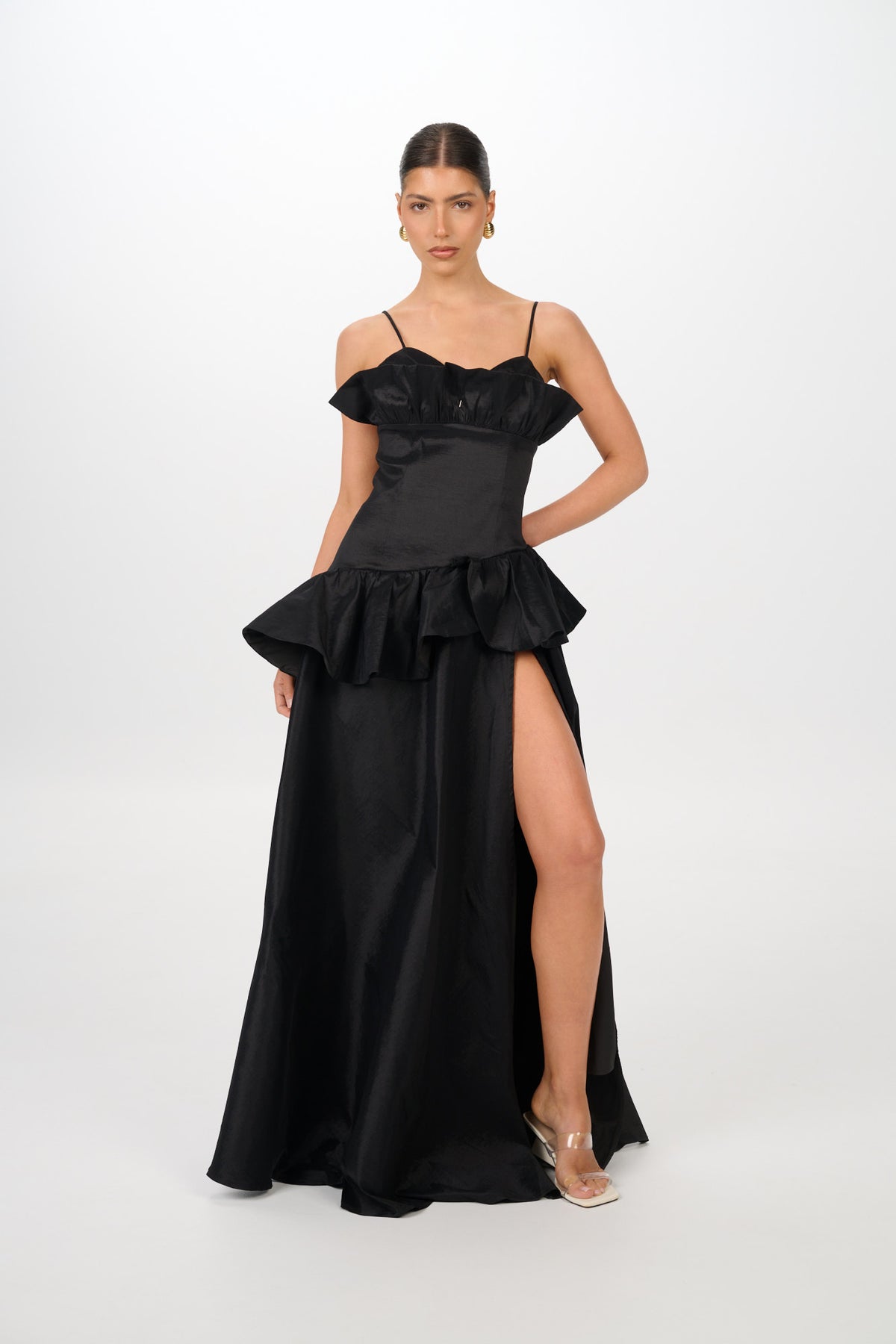 The SERENE Gown captures timeless femininity with a structured bodice, delicate shoulder straps, and sculptural ruffle detailing that frames the neckline and waist. Designed in a lustrous satin finish, the silhouette flows into a full skirt with a daring thigh-high split — balancing elegance with modern allure.