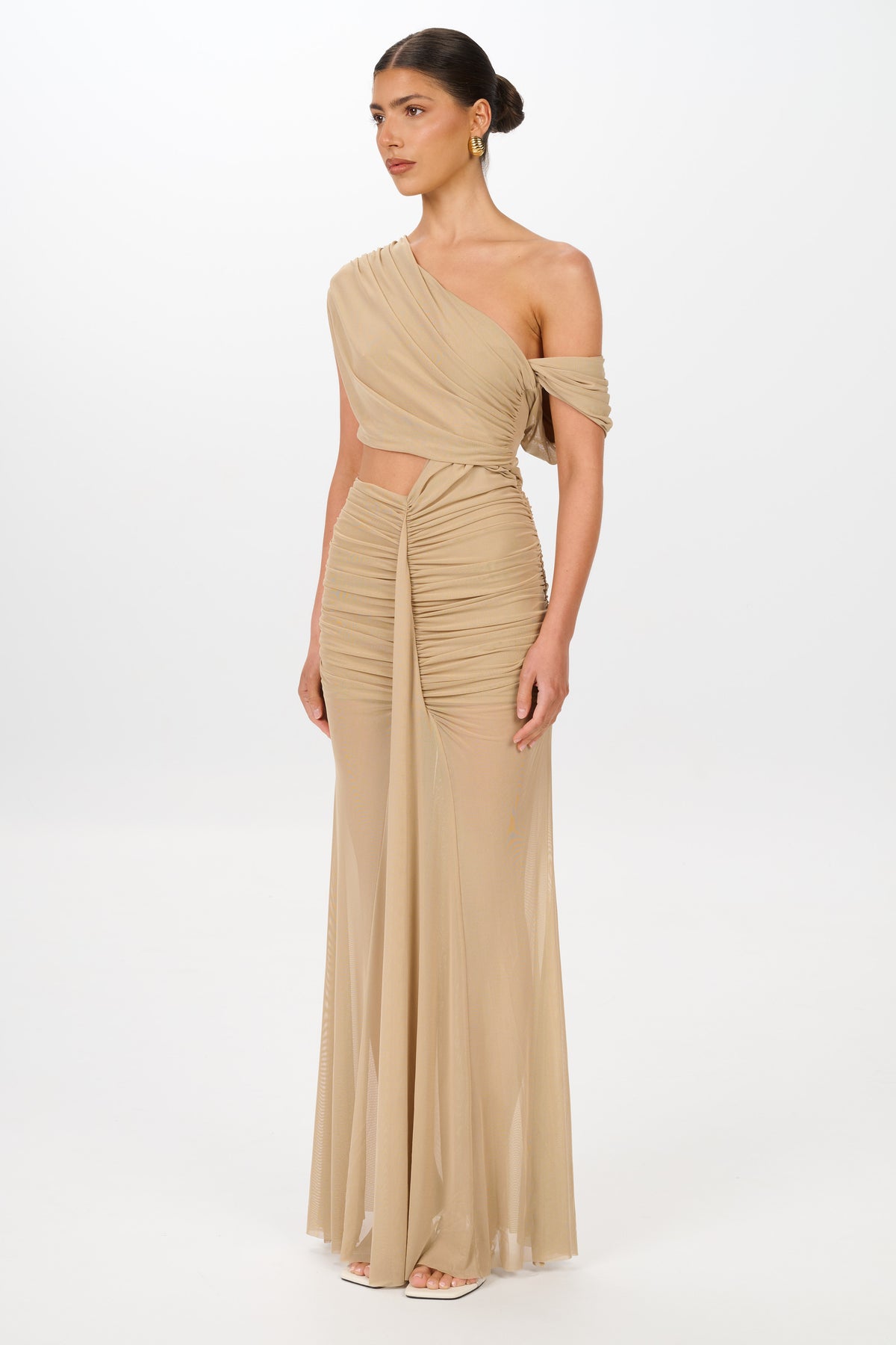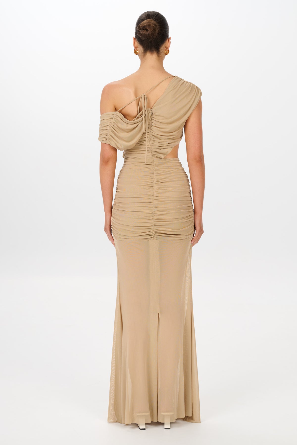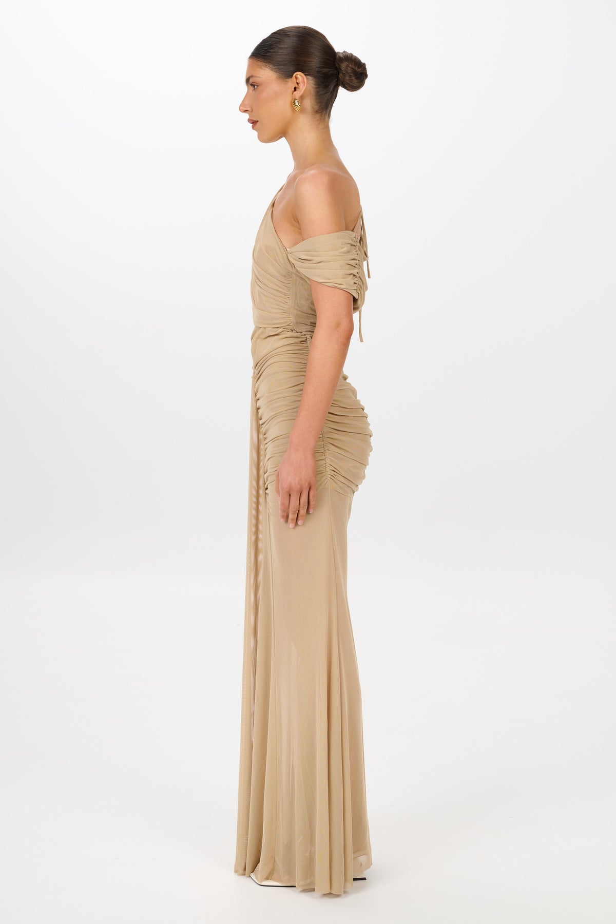 Just in time for Summer the versatile styling options, allowing you to wear it on or off the shoulders according to your preference. With ruching around the hips and a sheer skirt it beautifully accentuates feminine curves, making it a flattering choice for any event.