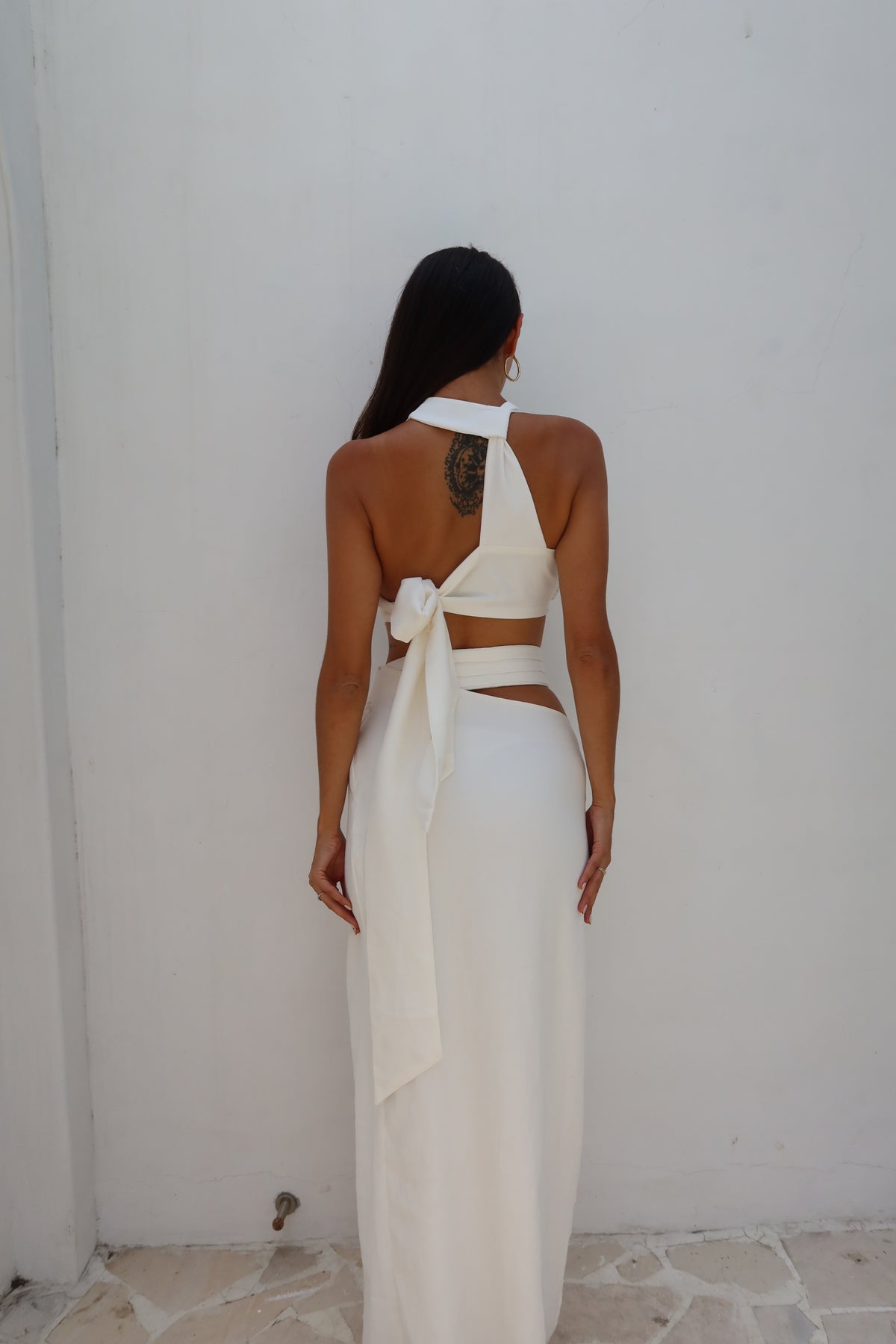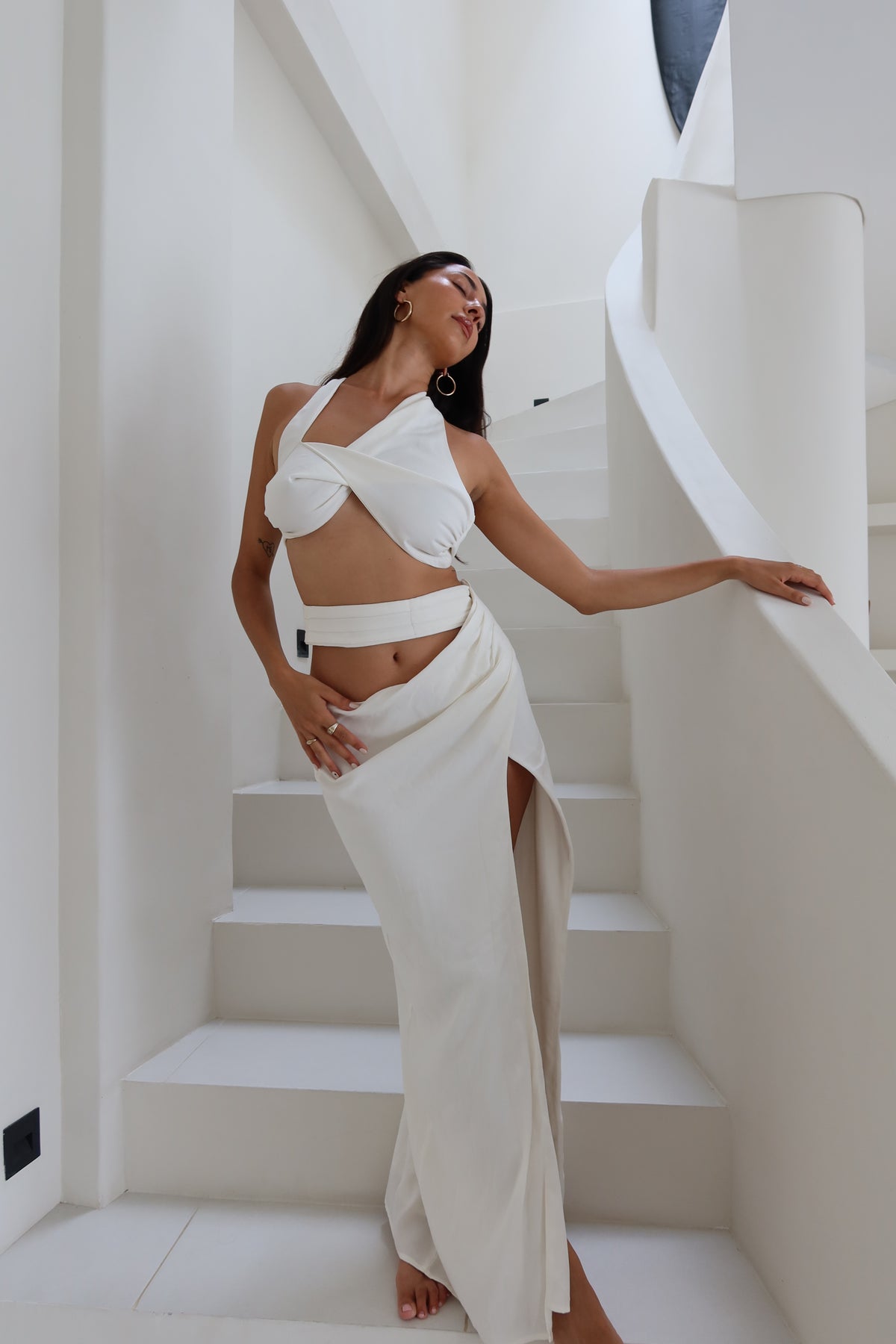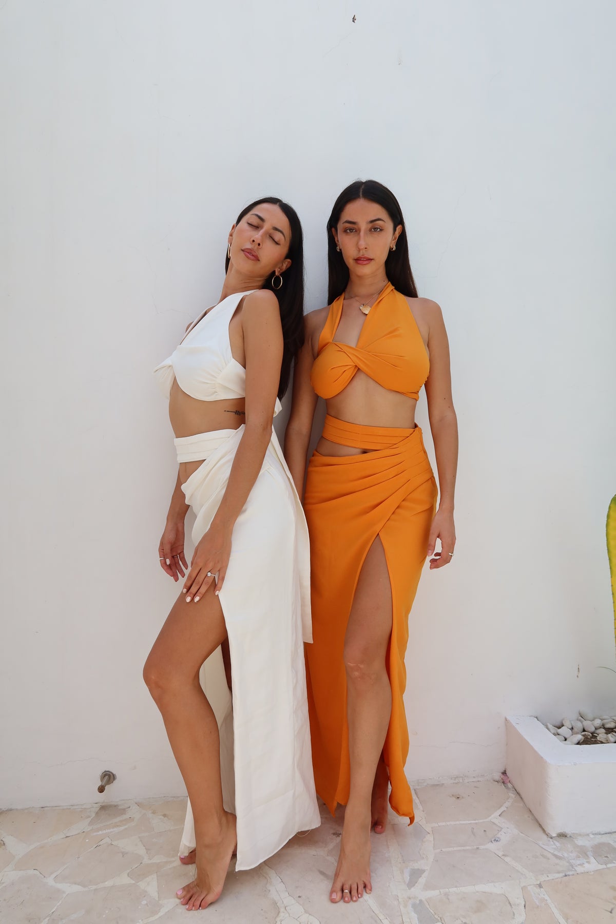 Introducing the Kalia Set – a captivating ensemble that effortlessly merges modern style with timeless elegance. The Kalia top features a chic wrap-around design, allowing you to customize the fit for a flattering silhouette. The delicate fabric drapes gracefully, creating a sophisticated look that exudes femininity and confidence. Paired seamlessly with the top, the Kalia skirt boasts a waistband that cinches at the waist, enhancing your curves with subtle allure. The pièce de résistance is the long drape extending from the waistband, adding a touch of drama and movement to your every step. A side split completes the ensemble, revealing just the right amount of leg for a hint of allure. With the Kalia Set, embrace a harmonious blend of sophistication and contemporary flair, making it an ideal choice for any occasion where you desire to make a lasting impression.