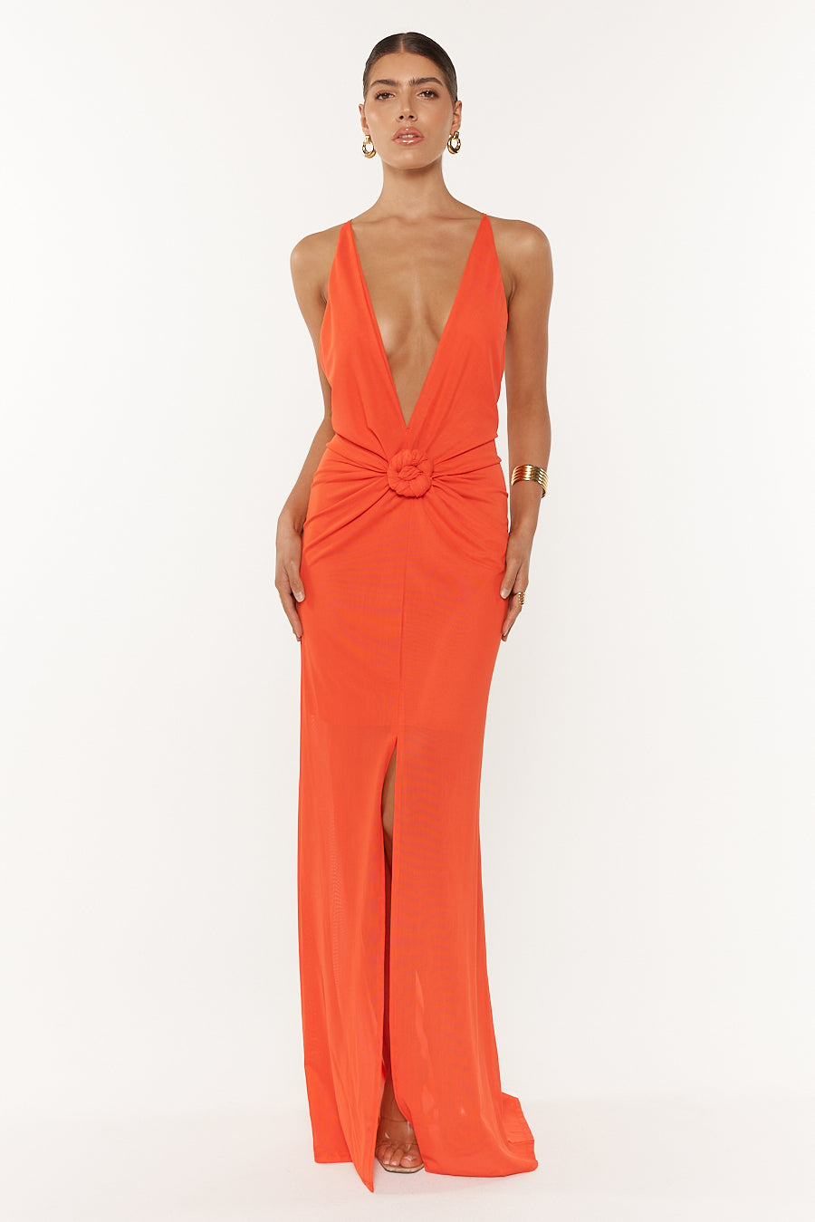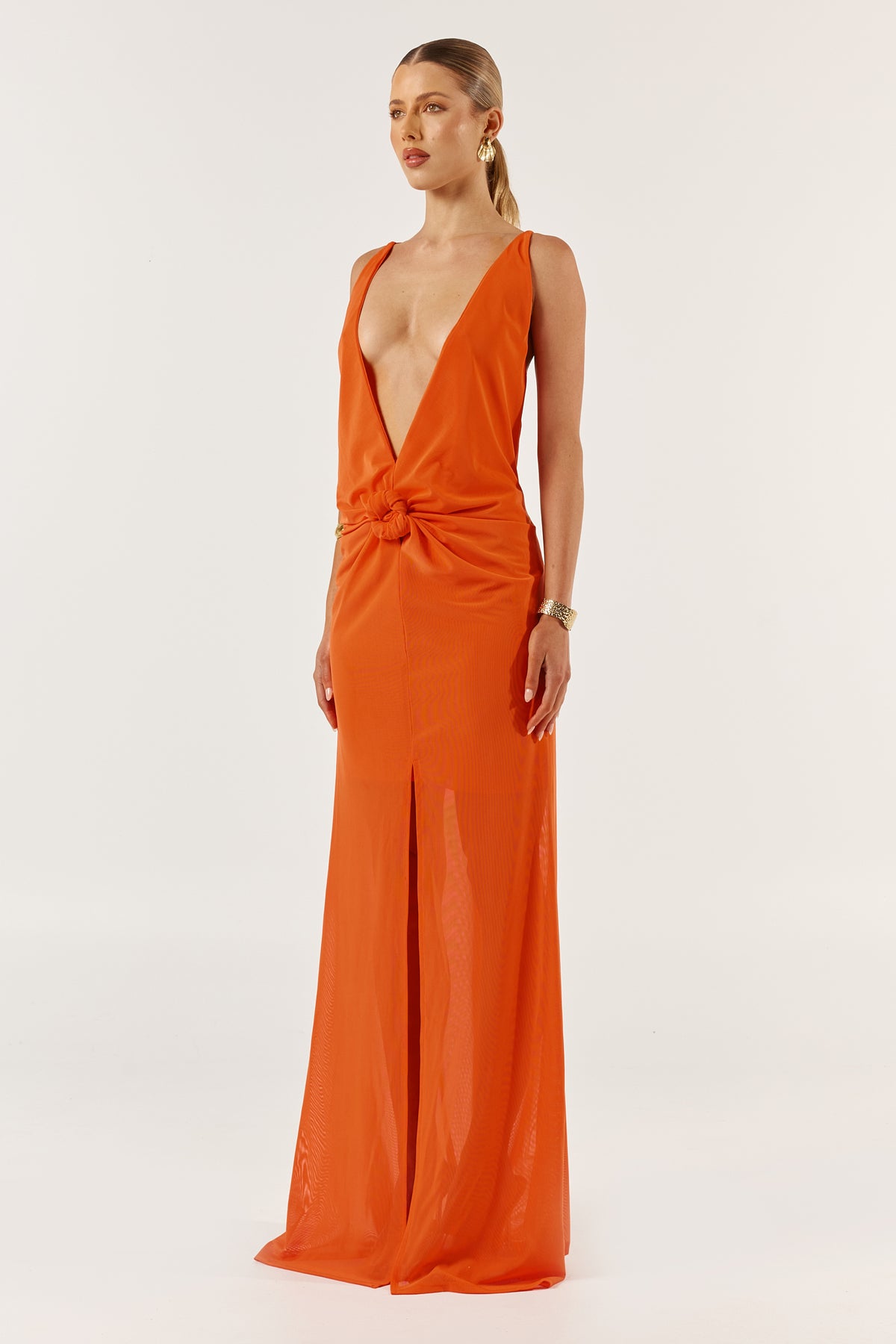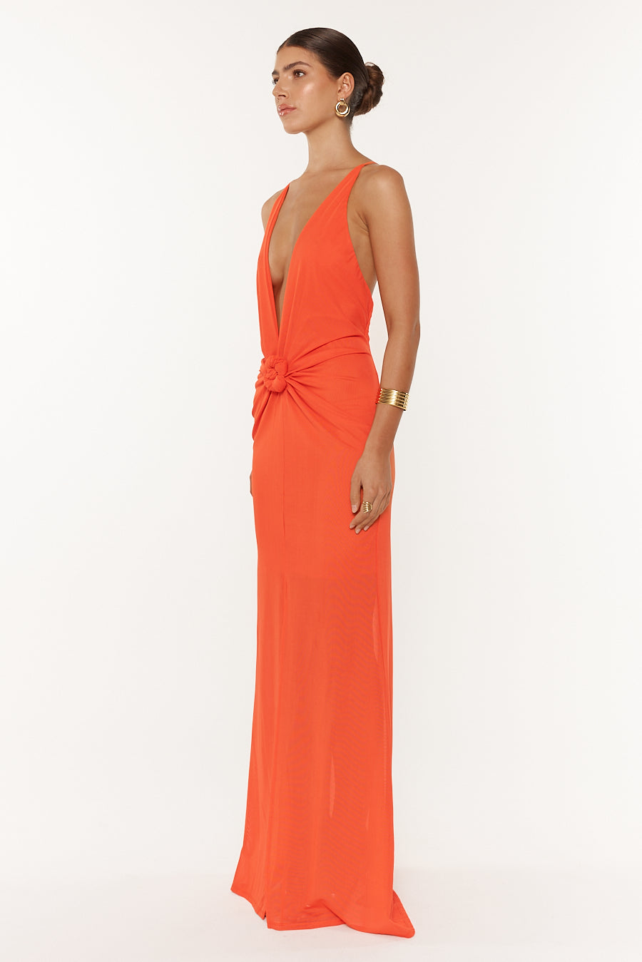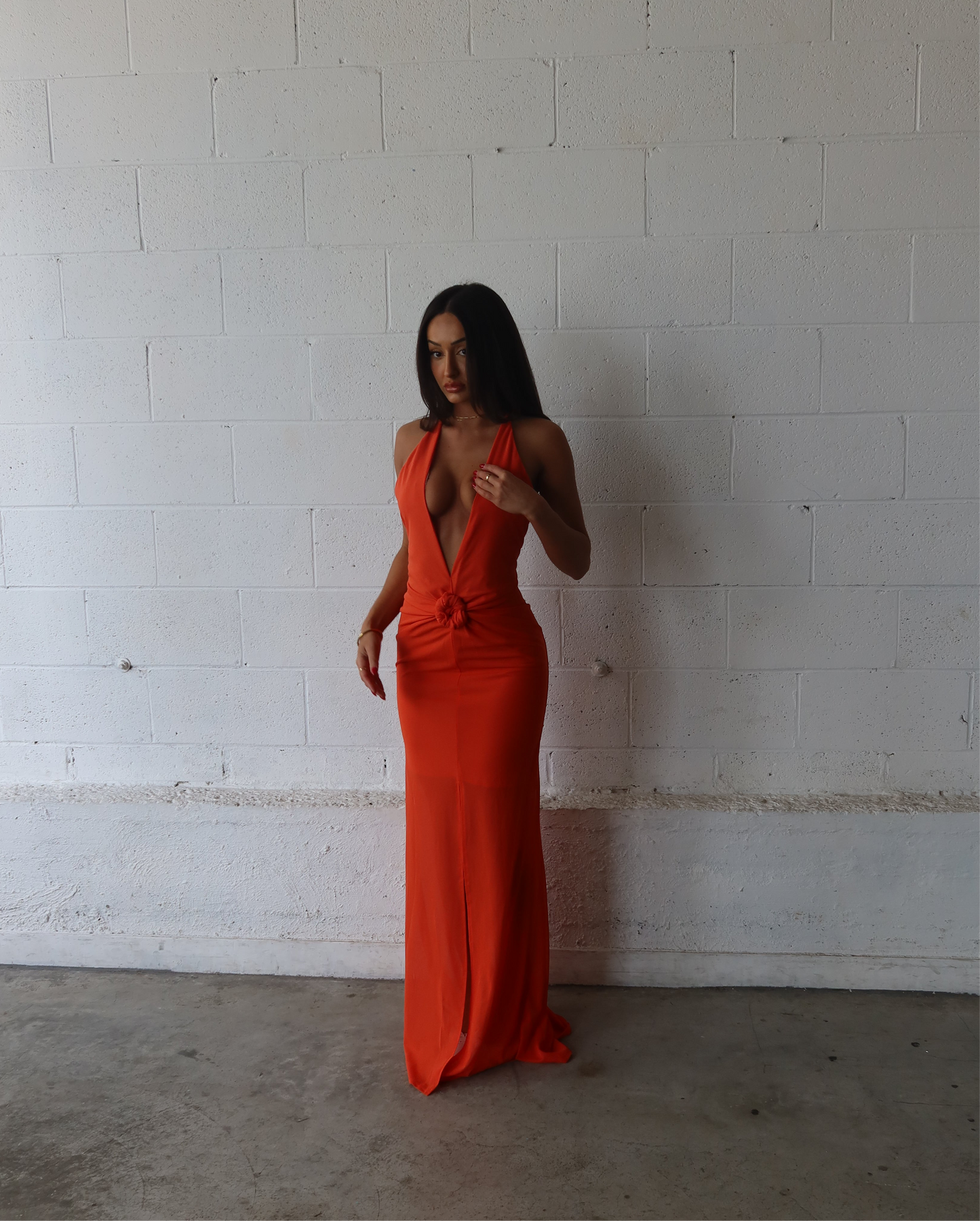 The Berlin is striking as ever in our tangerine. The dress features a deep V-neckline and a knotted detail at the waist, creating an eye-catching silhouette. The design is form-fitting, with a flowing skirt that adds elegance. The dress strikes a balance between boldness and sophistication, making it suitable for formal events or evening outings. The model enhances the look with minimal jewellery, allowing the dress to stand out.