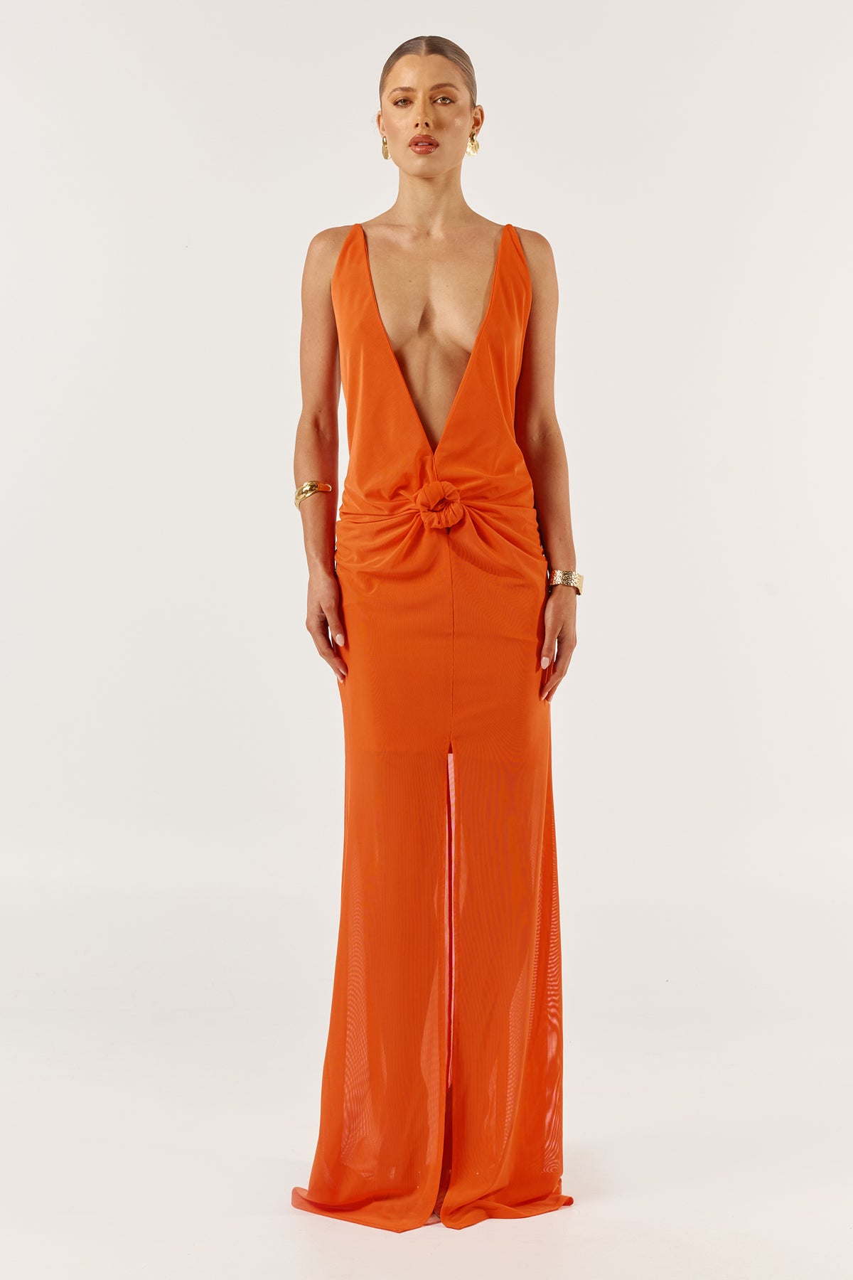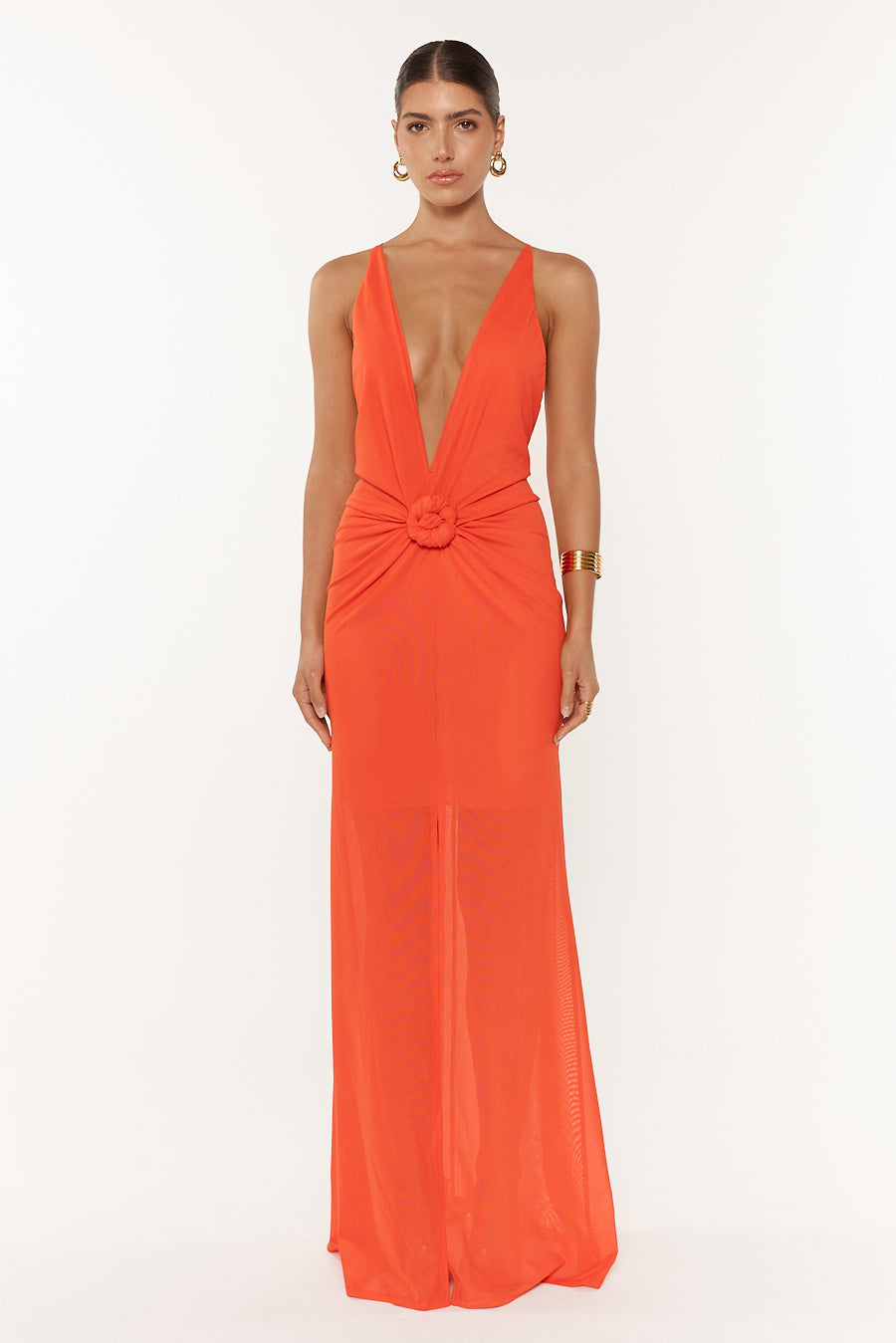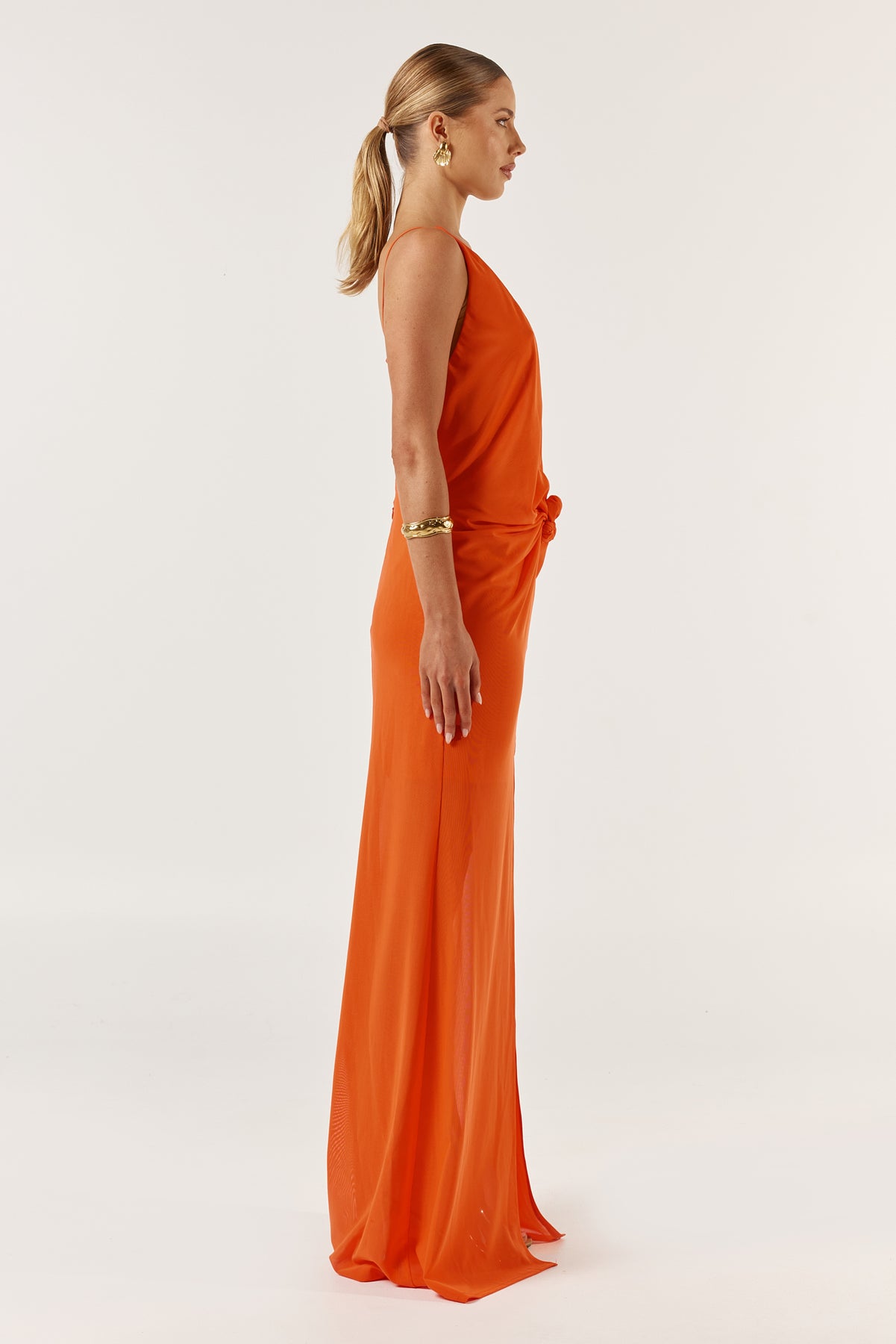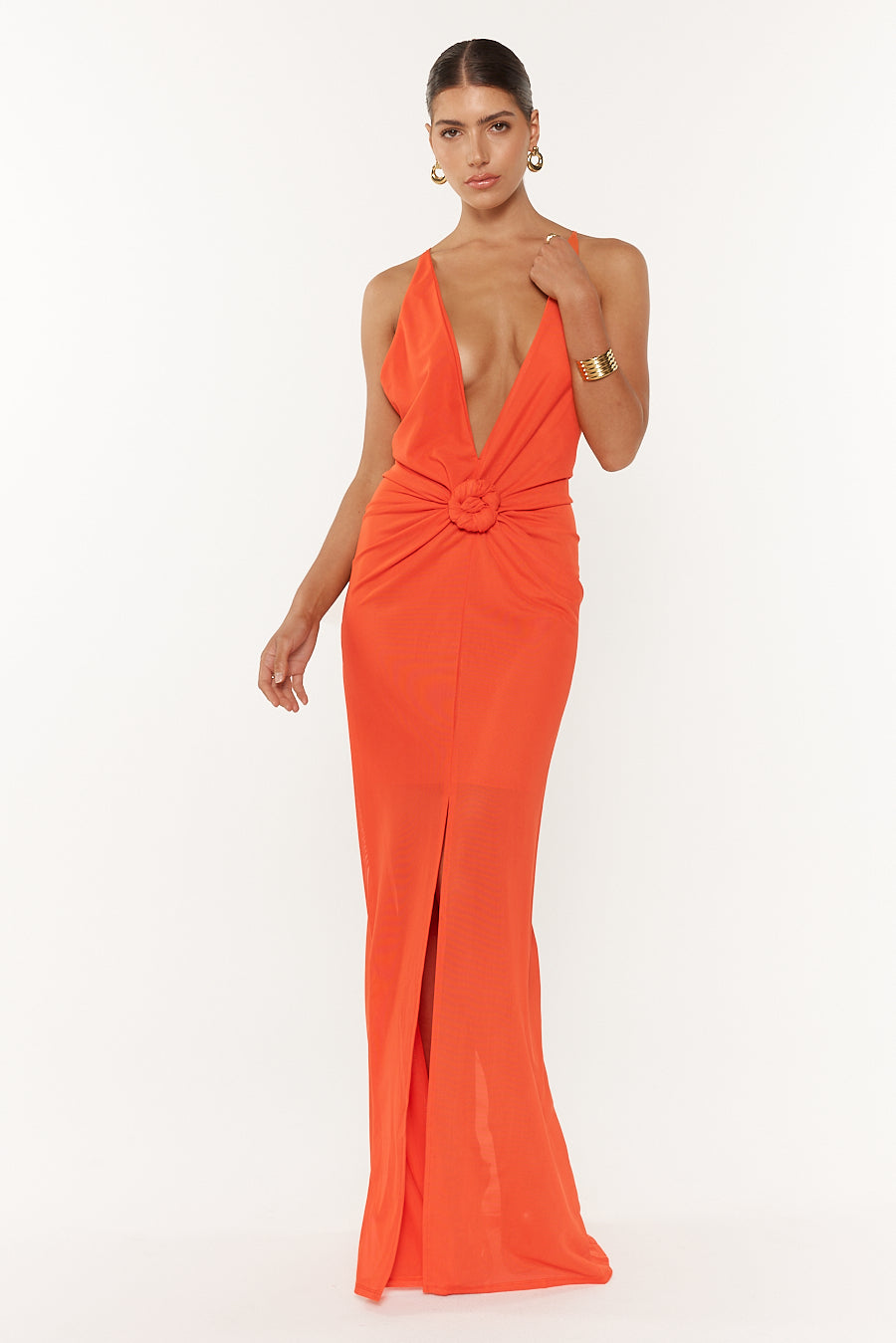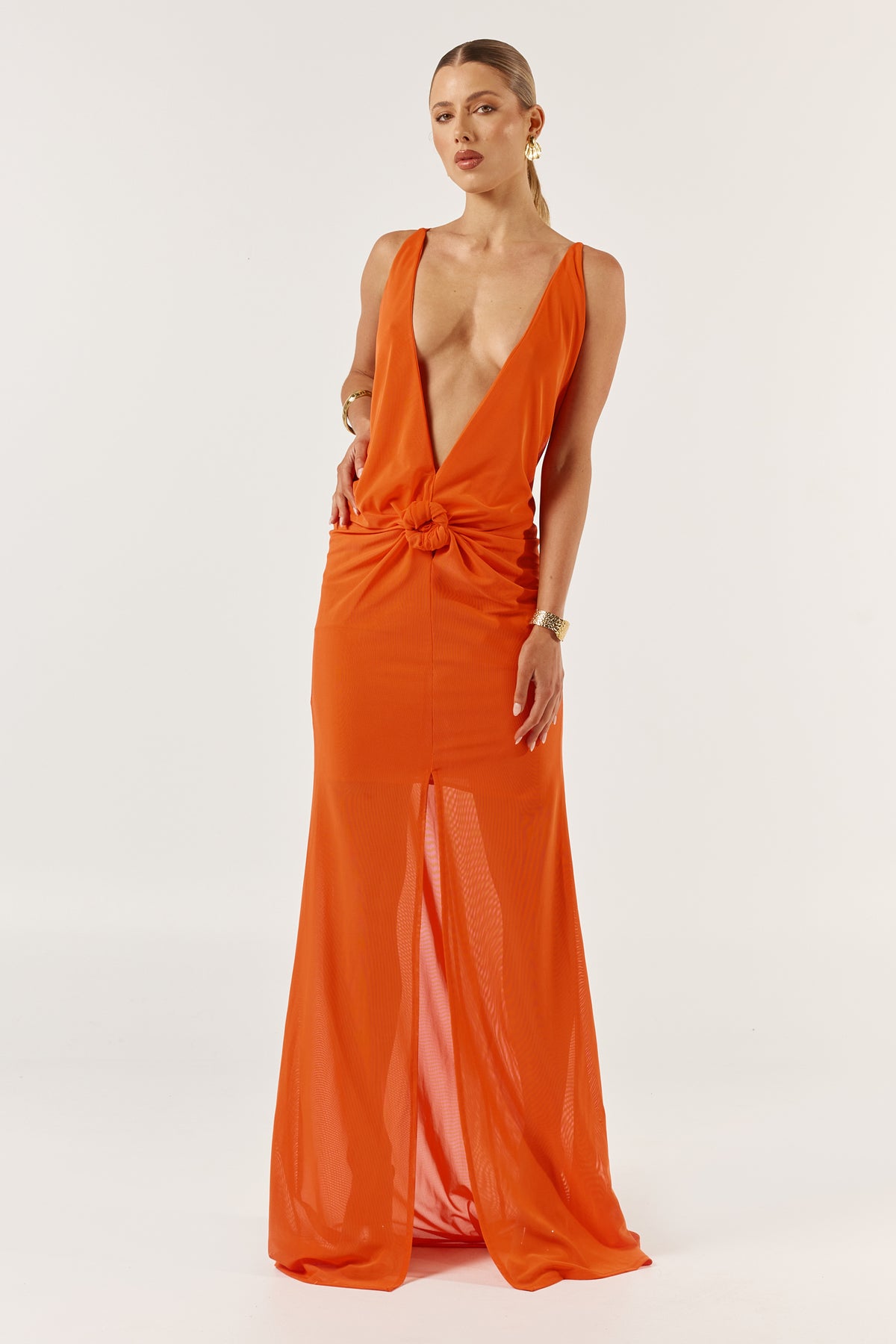 The Berlin is striking as ever in our tangerine. The dress features a deep V-neckline and a knotted detail at the waist, creating an eye-catching silhouette. The design is form-fitting, with a flowing skirt that adds elegance. The dress strikes a balance between boldness and sophistication, making it suitable for formal events or evening outings. The model enhances the look with minimal jewellery, allowing the dress to stand out.