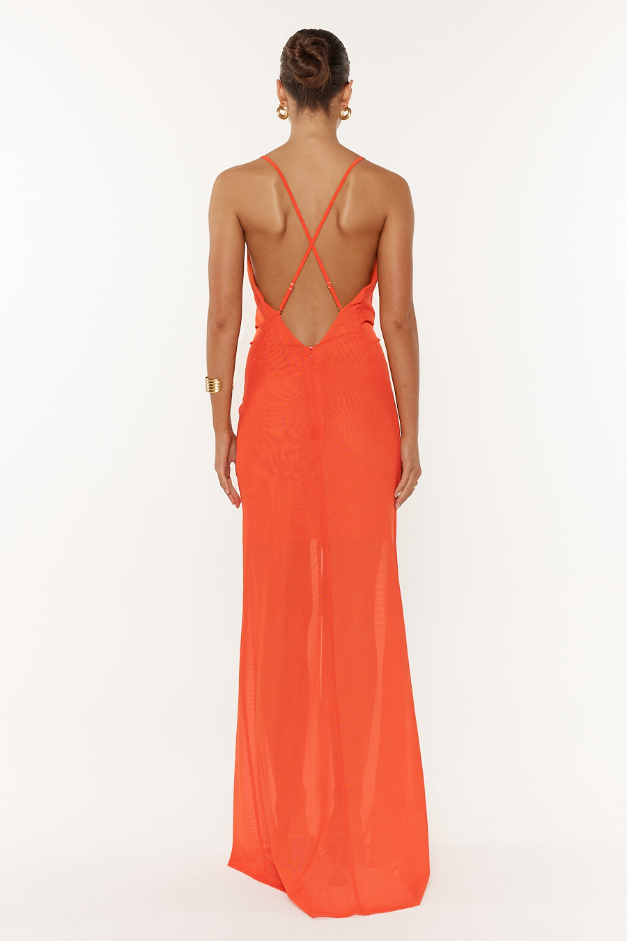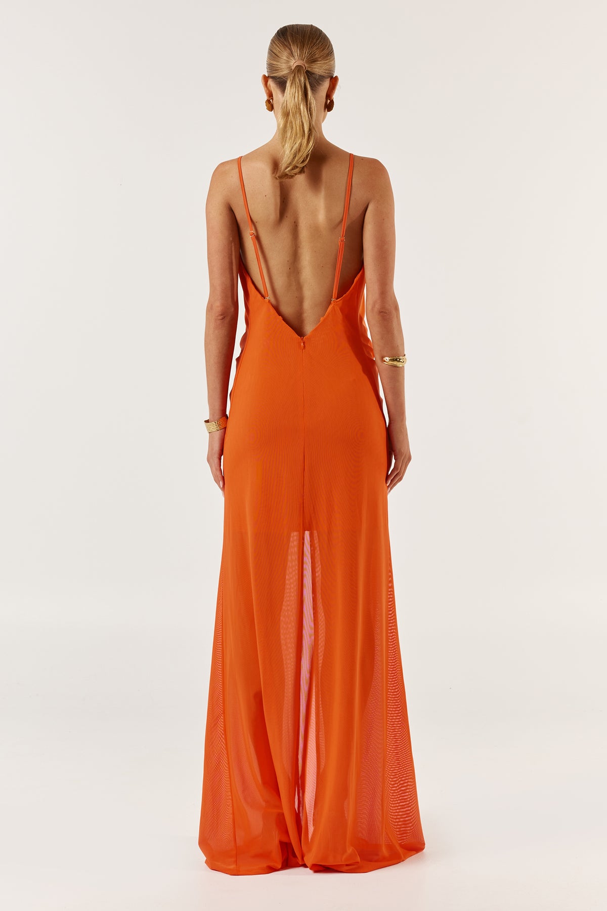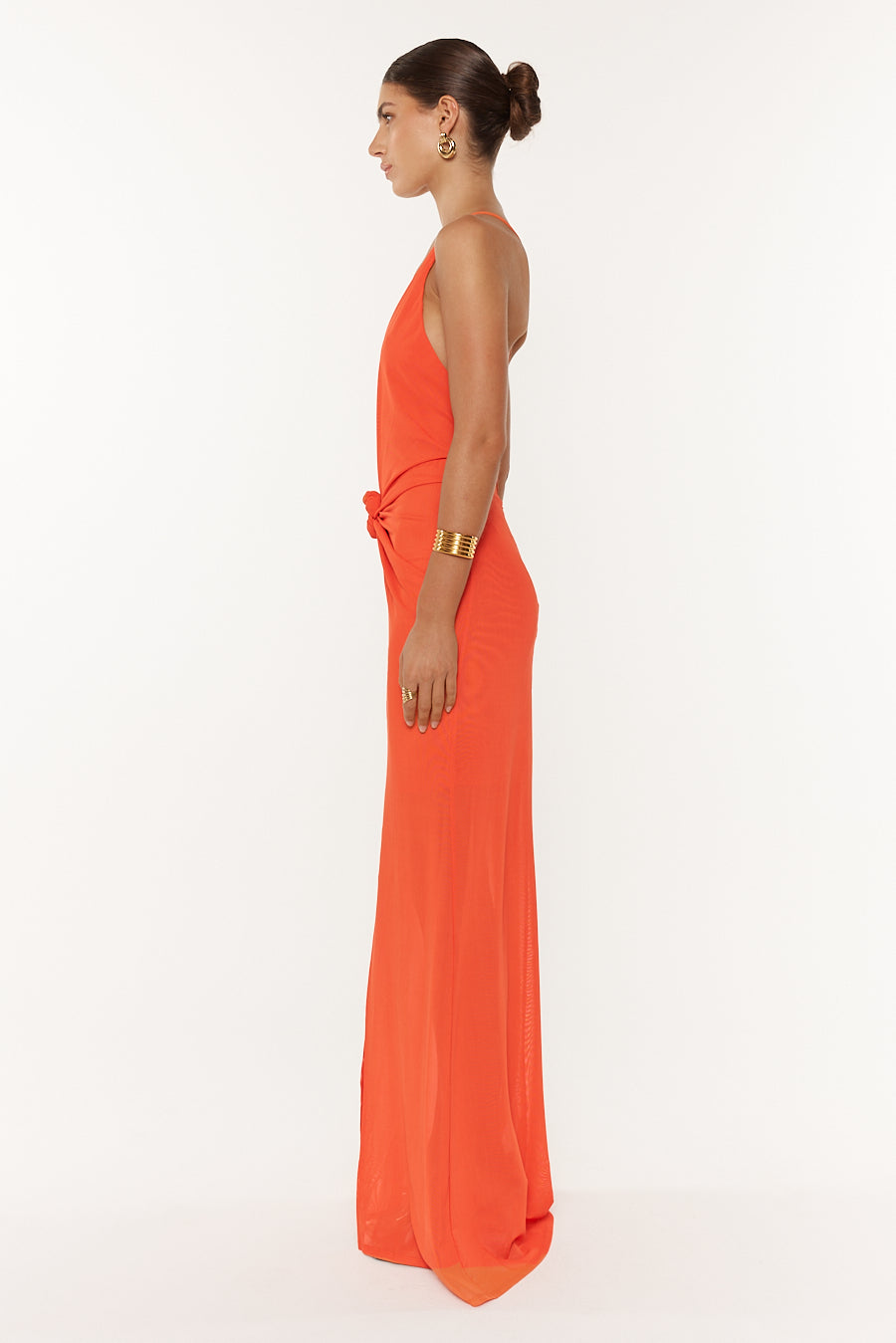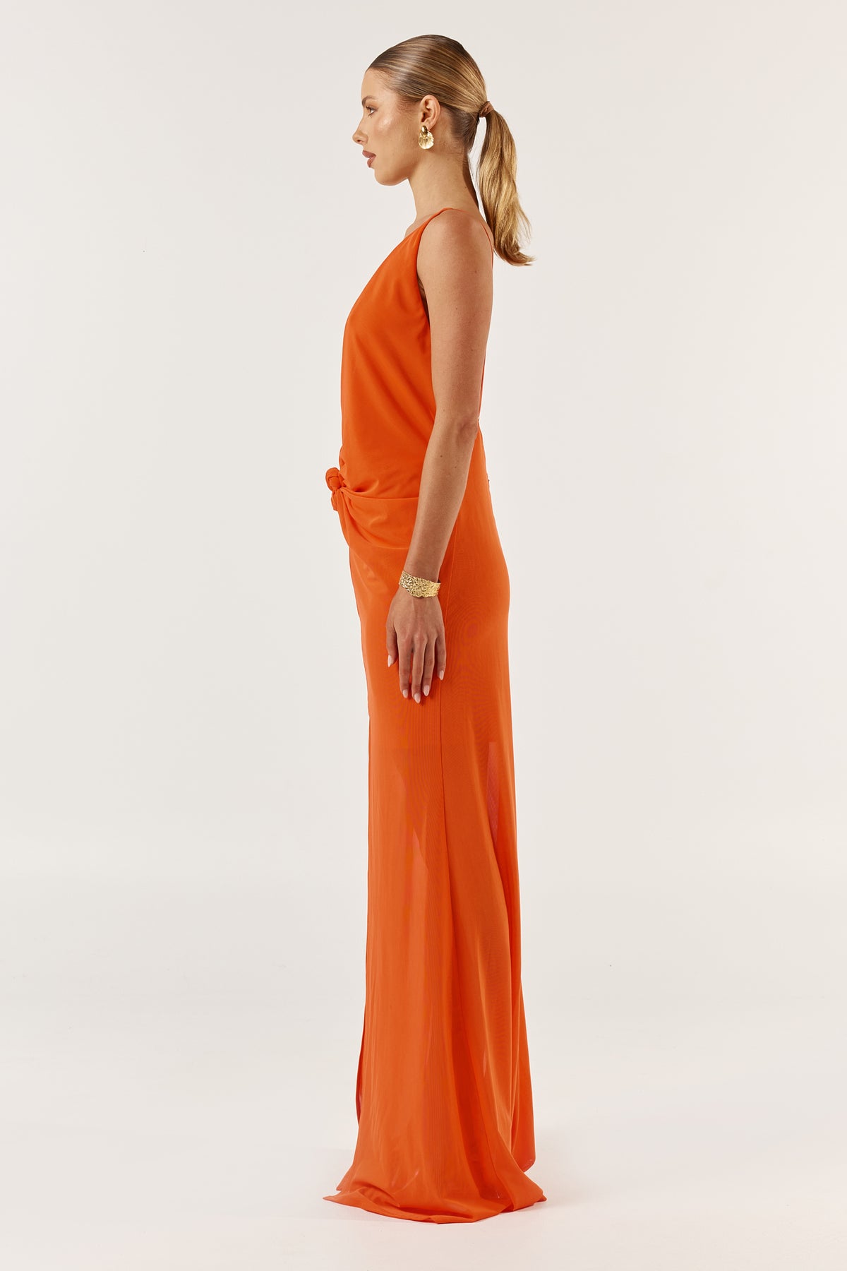 The Berlin is striking as ever in our tangerine. The dress features a deep V-neckline and a knotted detail at the waist, creating an eye-catching silhouette. The design is form-fitting, with a flowing skirt that adds elegance. The dress strikes a balance between boldness and sophistication, making it suitable for formal events or evening outings. The model enhances the look with minimal jewellery, allowing the dress to stand out.