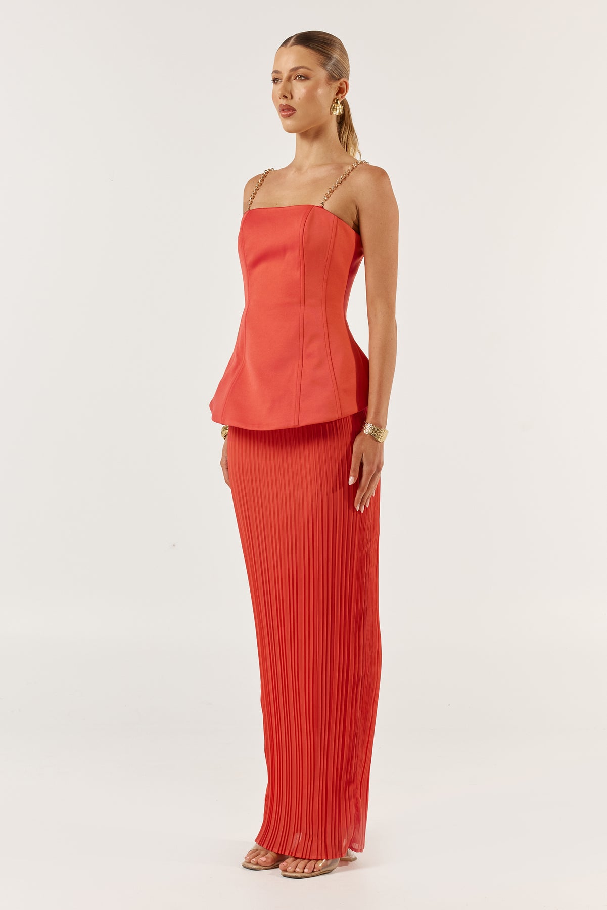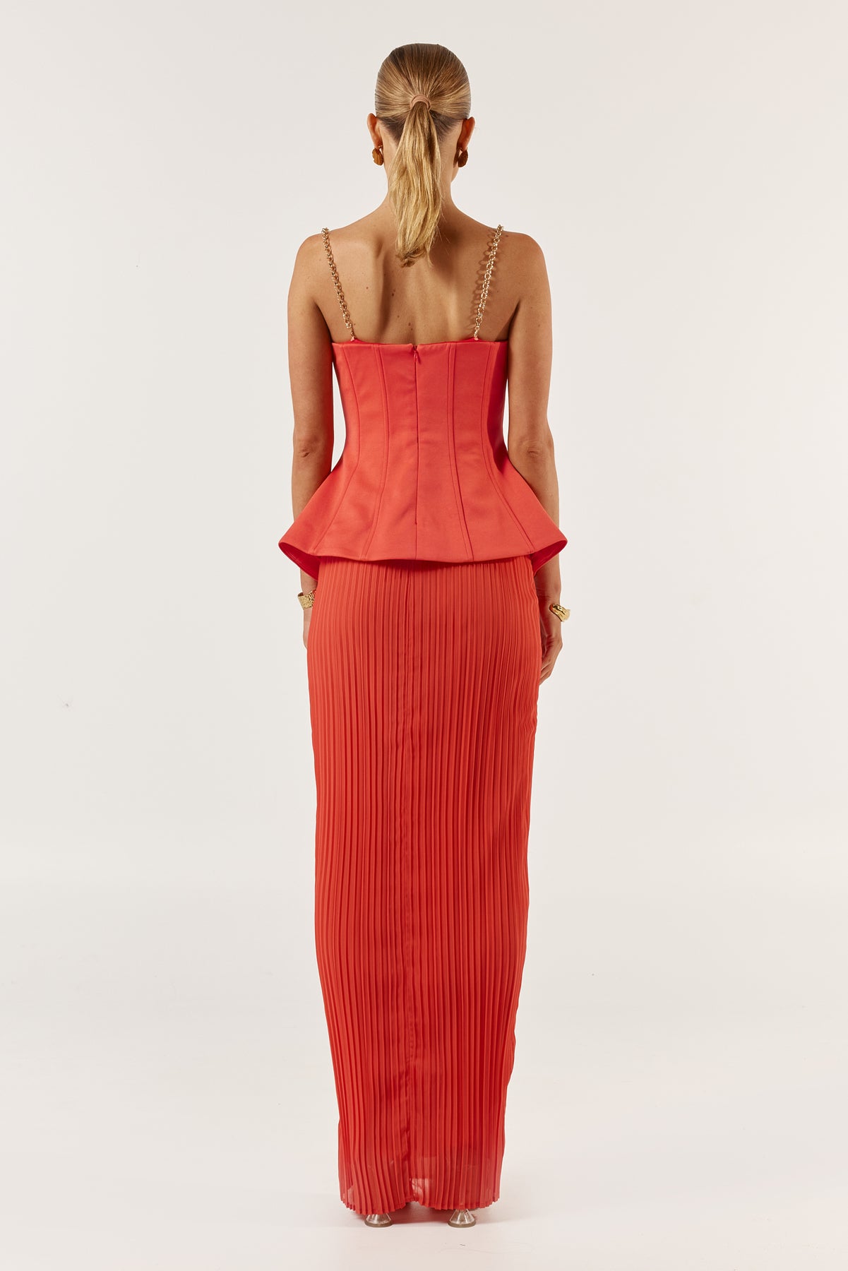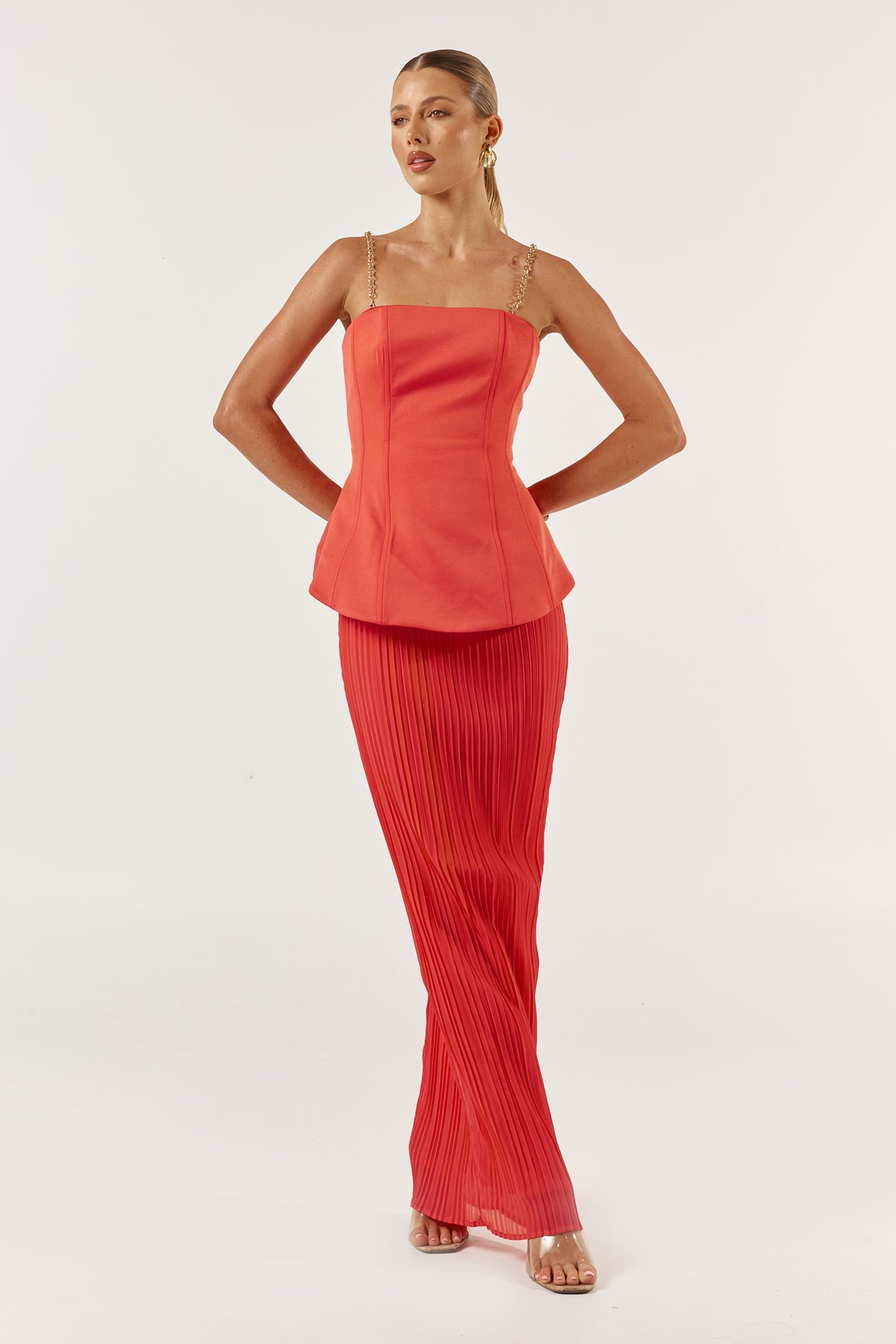 The Marcelle dress in tangerine features a structured peplum design that cinches the waist, creating a flattering silhouette. The peplum detail is complemented by detachable chains, allowing the dress to be worn both with loose like straps or as a strapless design. Moving down, the dress transitions into a sleek pencil skirt with elegant pleats that add subtle movement and texture, maintaining an overall sophisticated and tailored look.