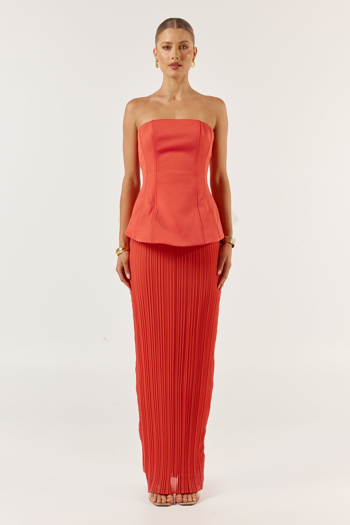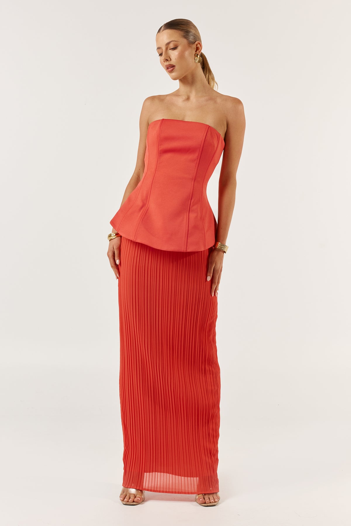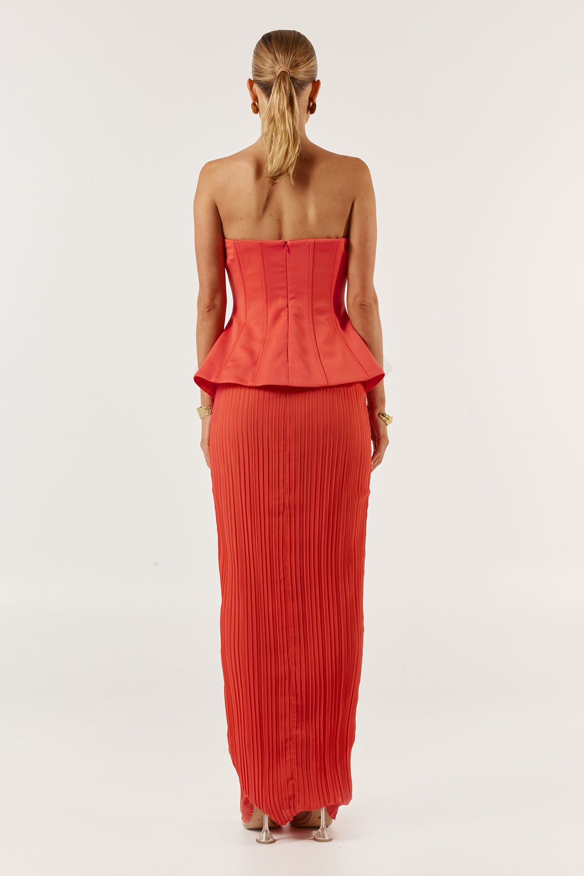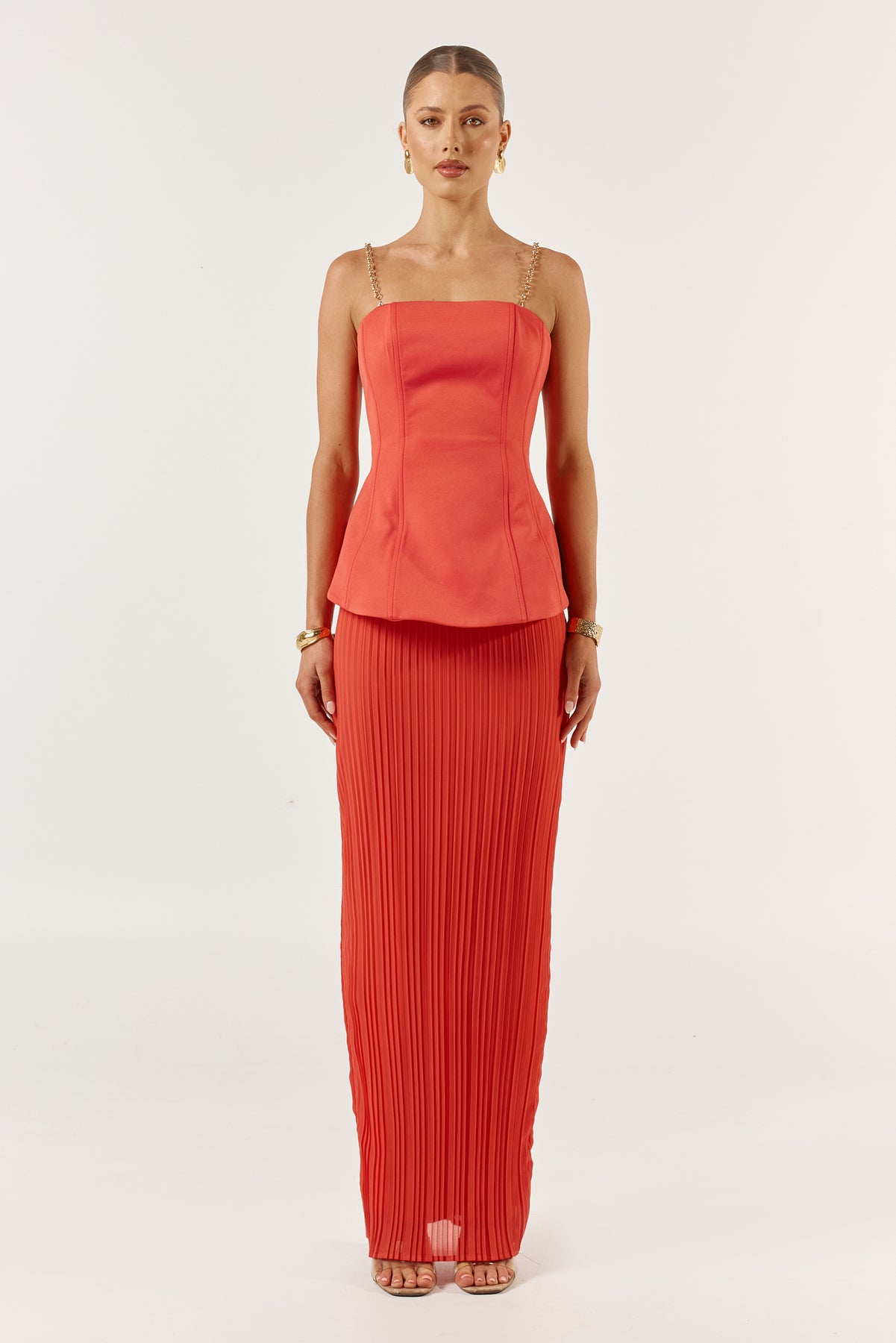 The Marcelle dress in tangerine features a structured peplum design that cinches the waist, creating a flattering silhouette. The peplum detail is complemented by detachable chains, allowing the dress to be worn both with loose like straps or as a strapless design. Moving down, the dress transitions into a sleek pencil skirt with elegant pleats that add subtle movement and texture, maintaining an overall sophisticated and tailored look.