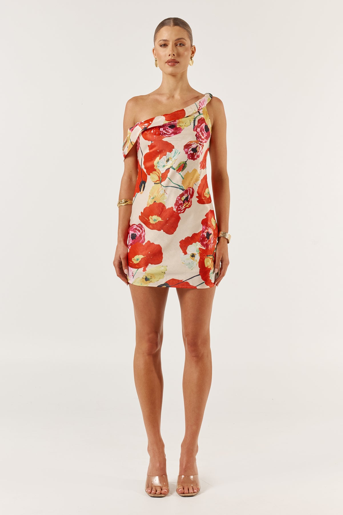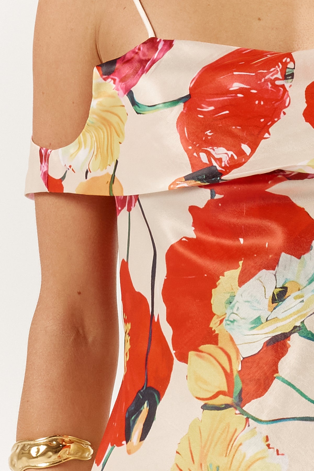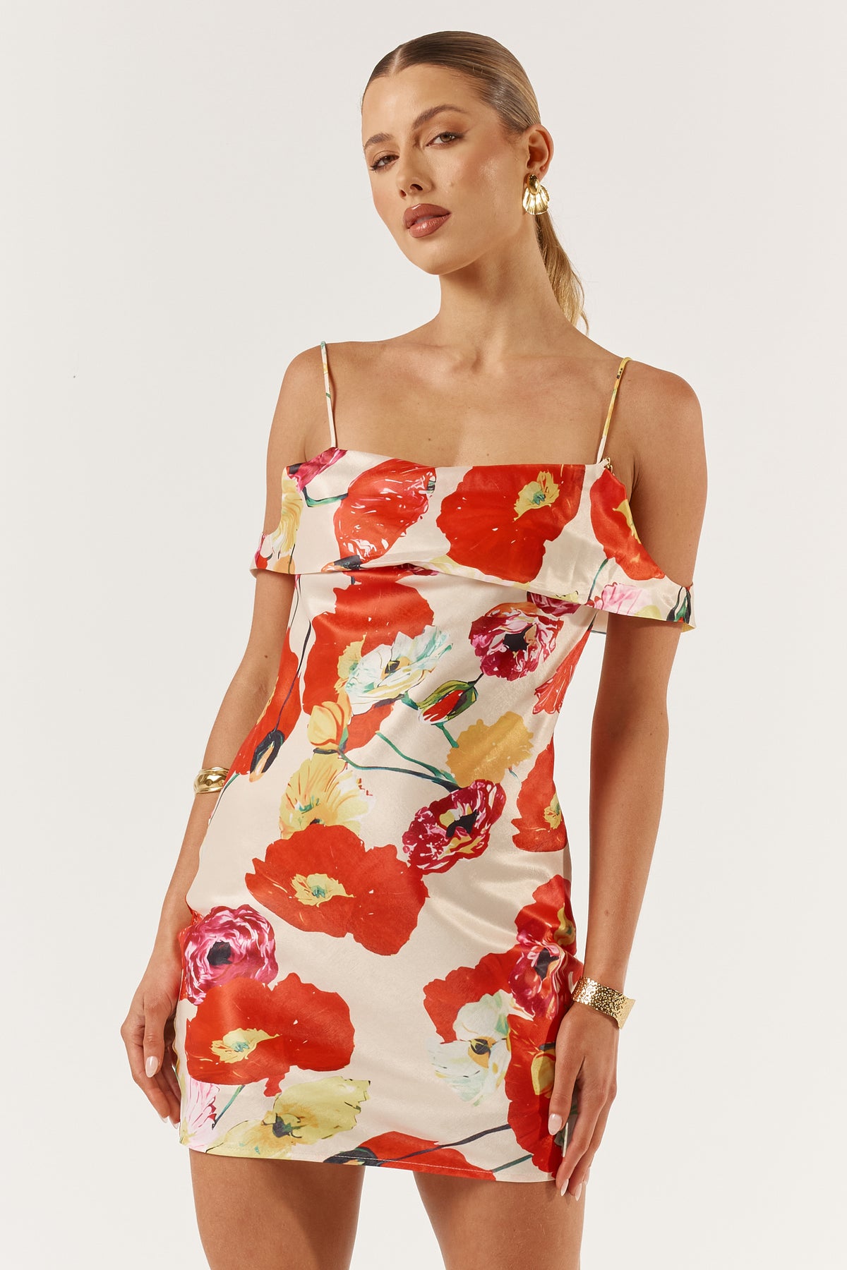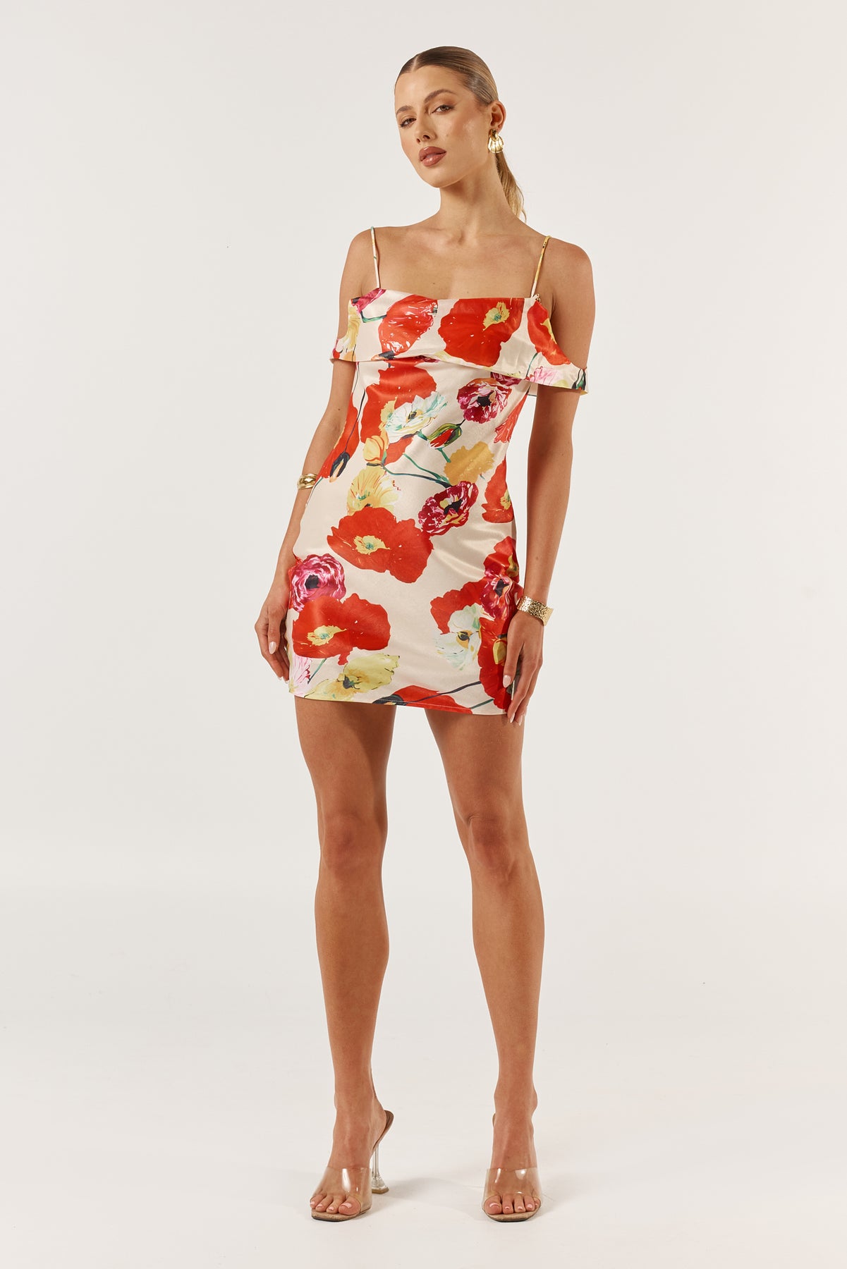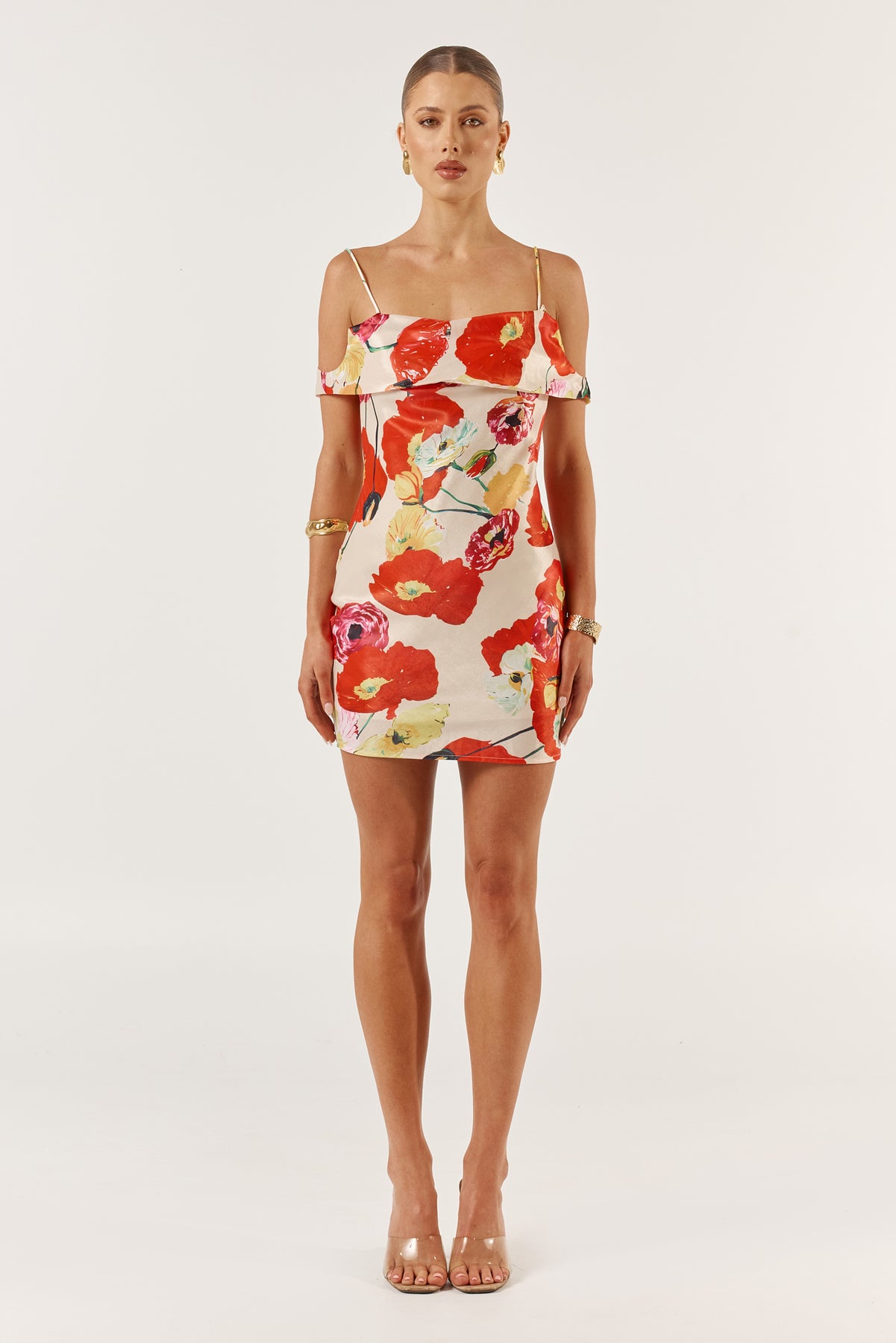 The playful Michela Mini is off-the-shoulder with our vivid red and yellow Poppy Print. It has a fitted silhouette that accentuates the figure, with thin straps and a flared design at the sleeves. This dress is ideal for casual outings, summer parties, or daytime events, paired nicely with minimal accessories for a fresh look.
