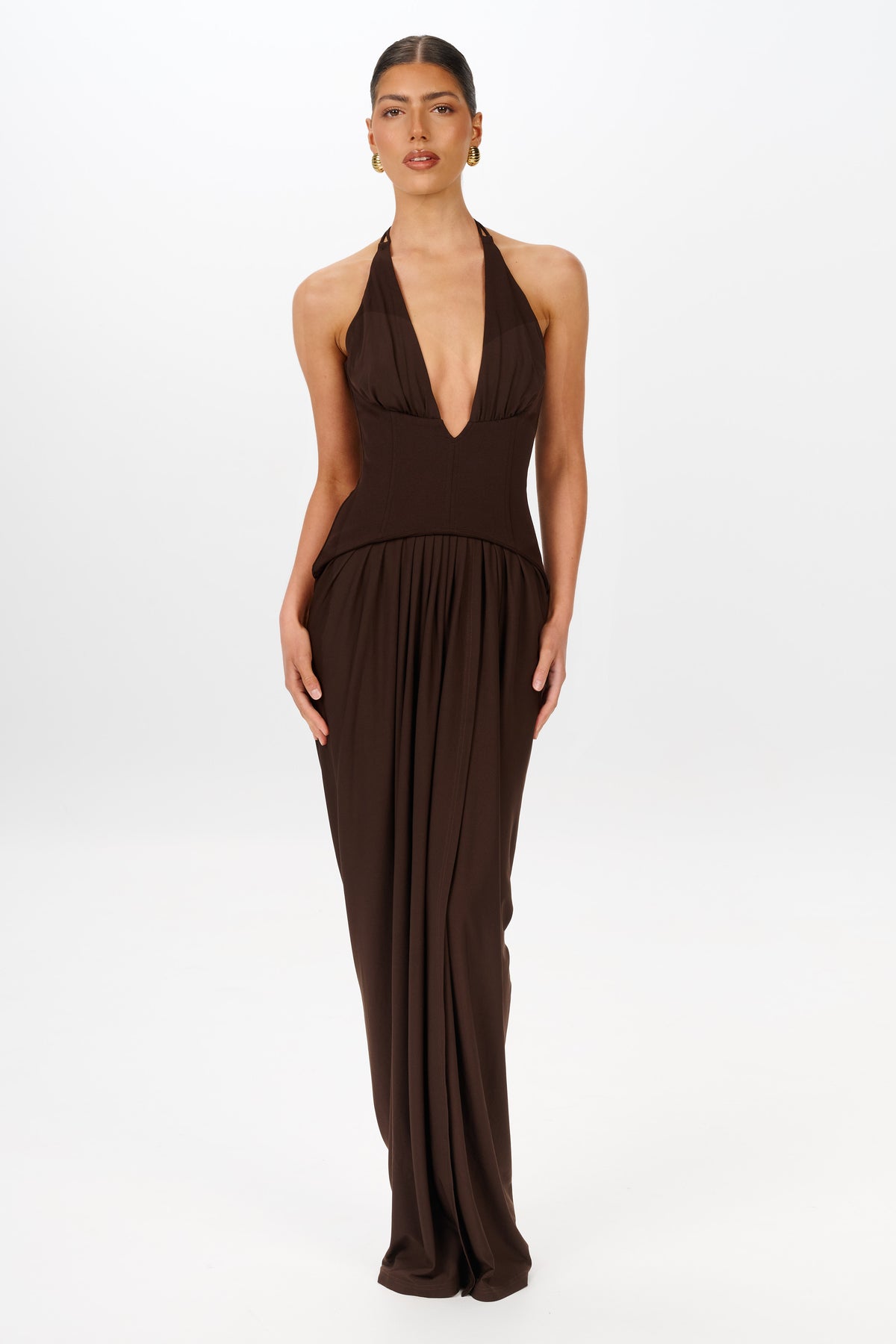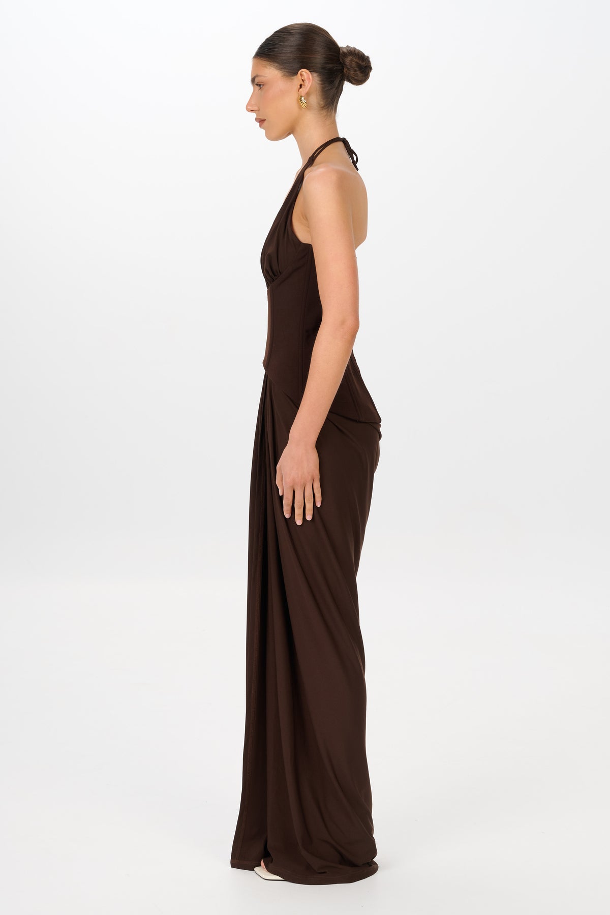 The Landon Dress is crafted from a soft stretch jersey that moves fluidly with the body, draping into a floor-length silhouette that commands attention. The deep halter neckline frames the décolletage while structured paneling contours the waist in a thick crepe for a sculpted fit. A subtle front split reveals the leg with effortless grace, balancing allure and sophistication.