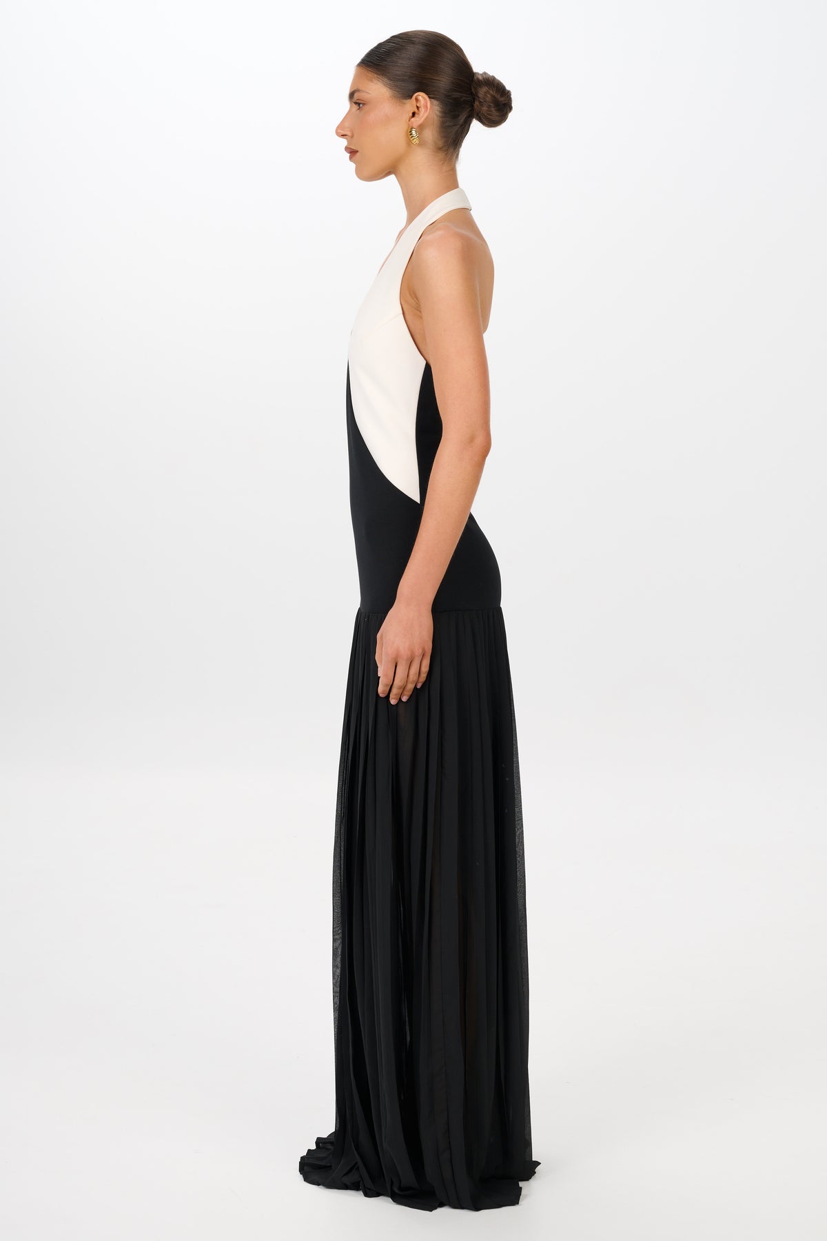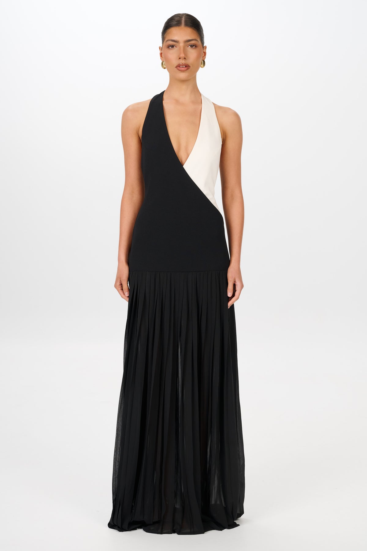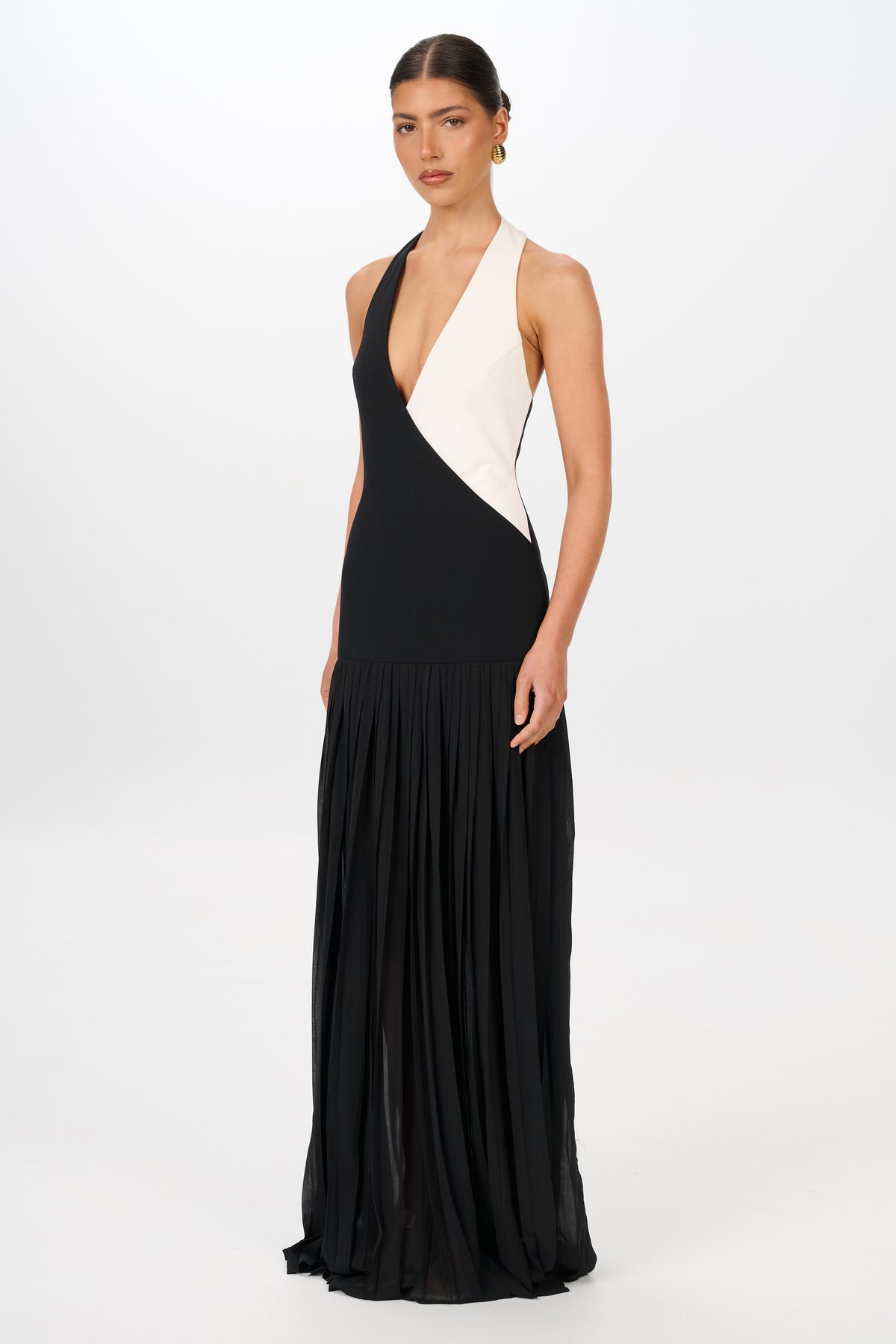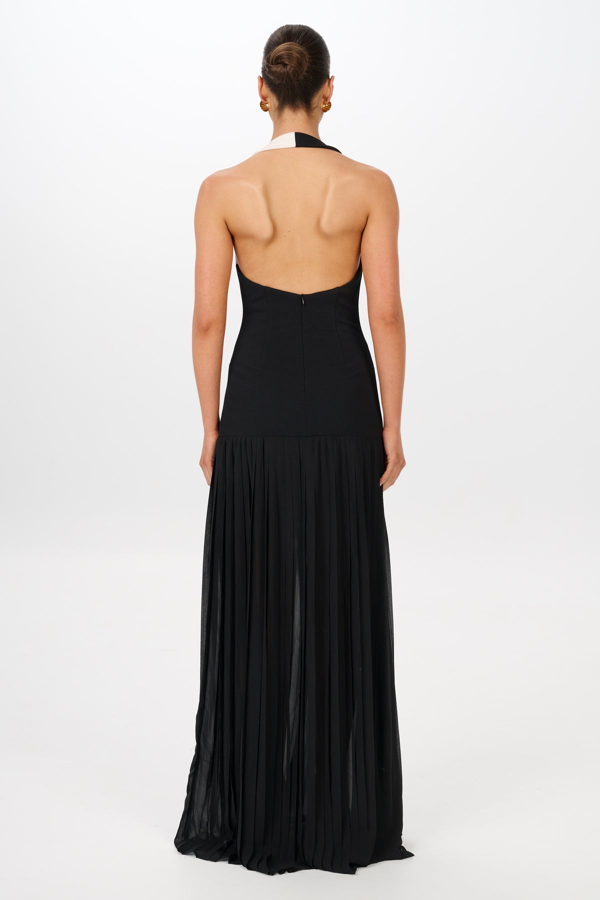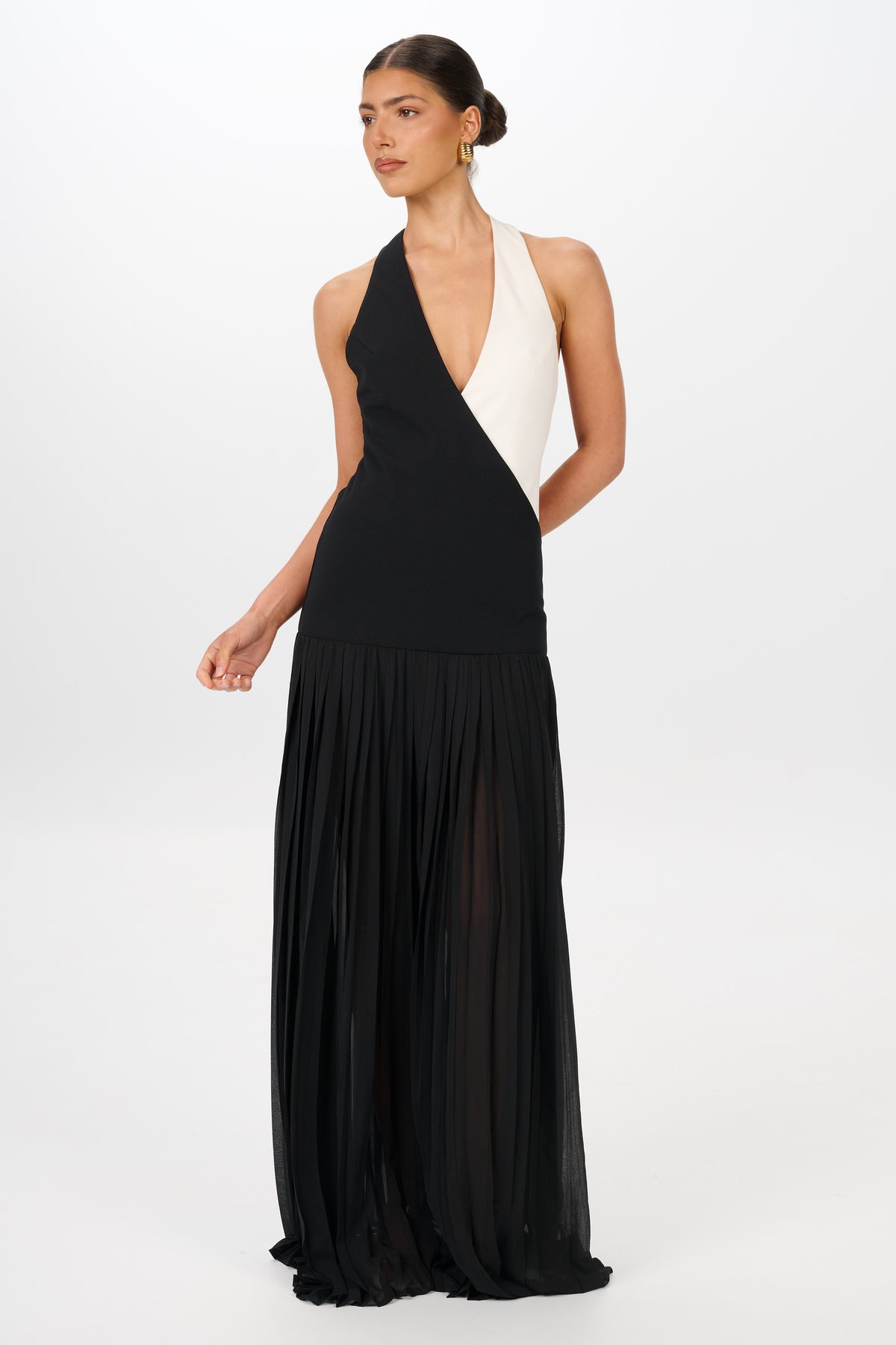 The Lara Dress features a sleek halter neckline that fastens elegantly with three covered buttons at the nape, framing an open back and sculpted silhouette. Crafted in a striking black and white contrast, the design elongates the figure through clean diagonal lines that meet a fluid, pleated skirt.