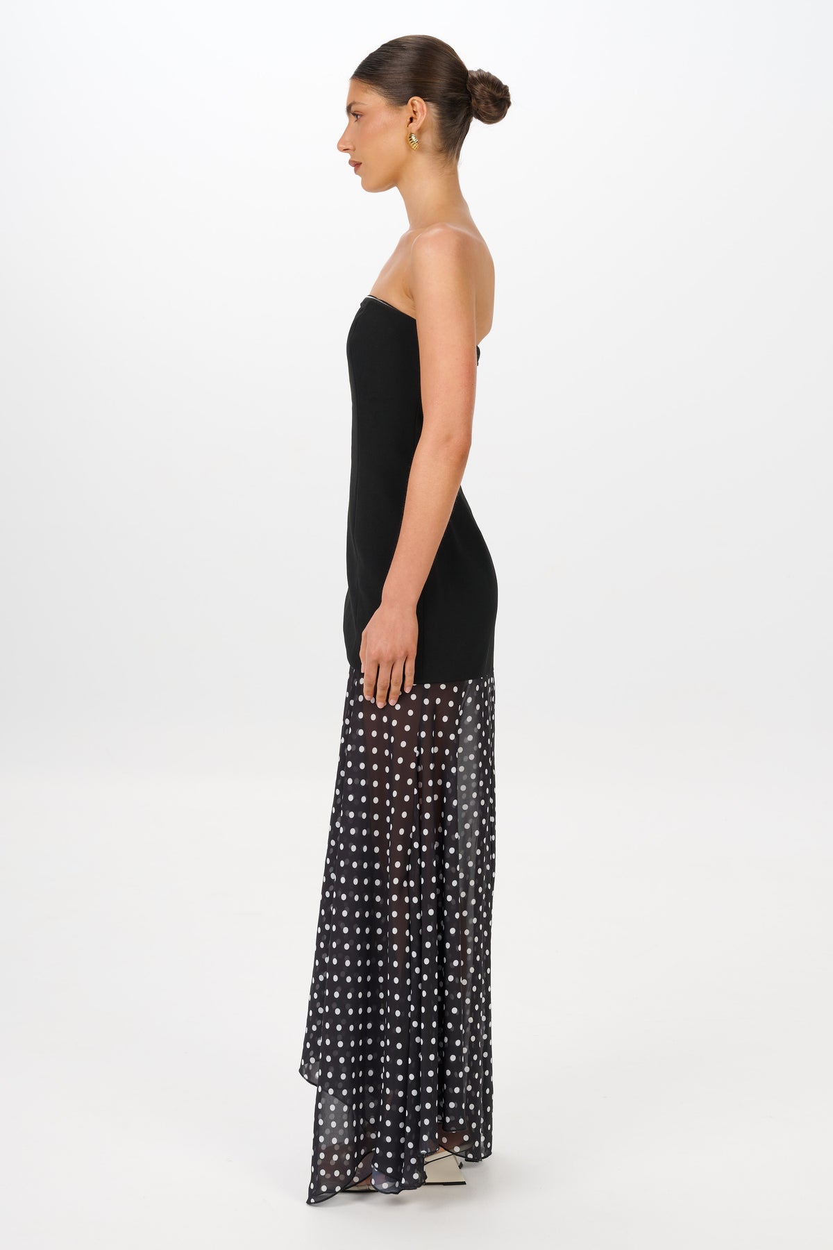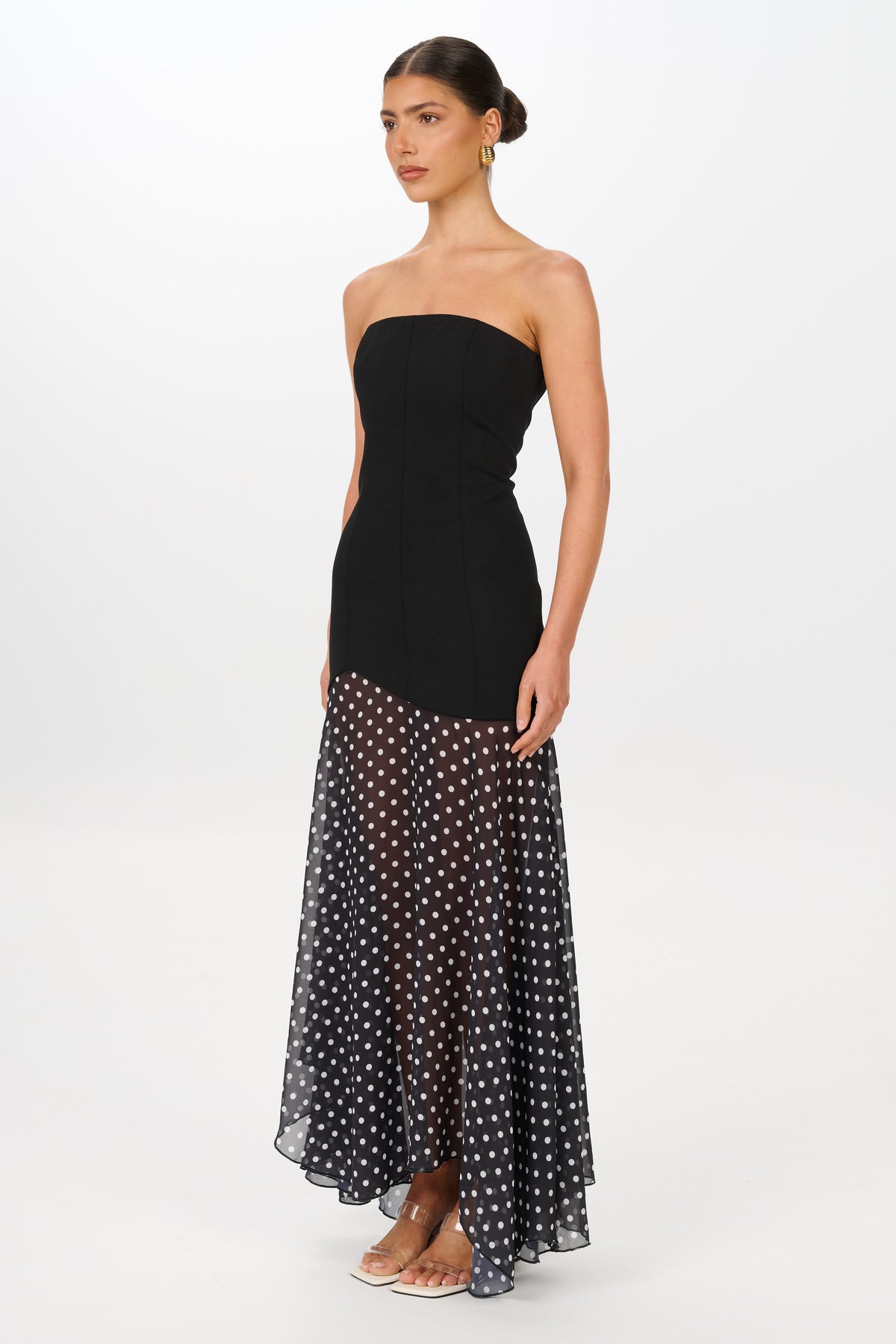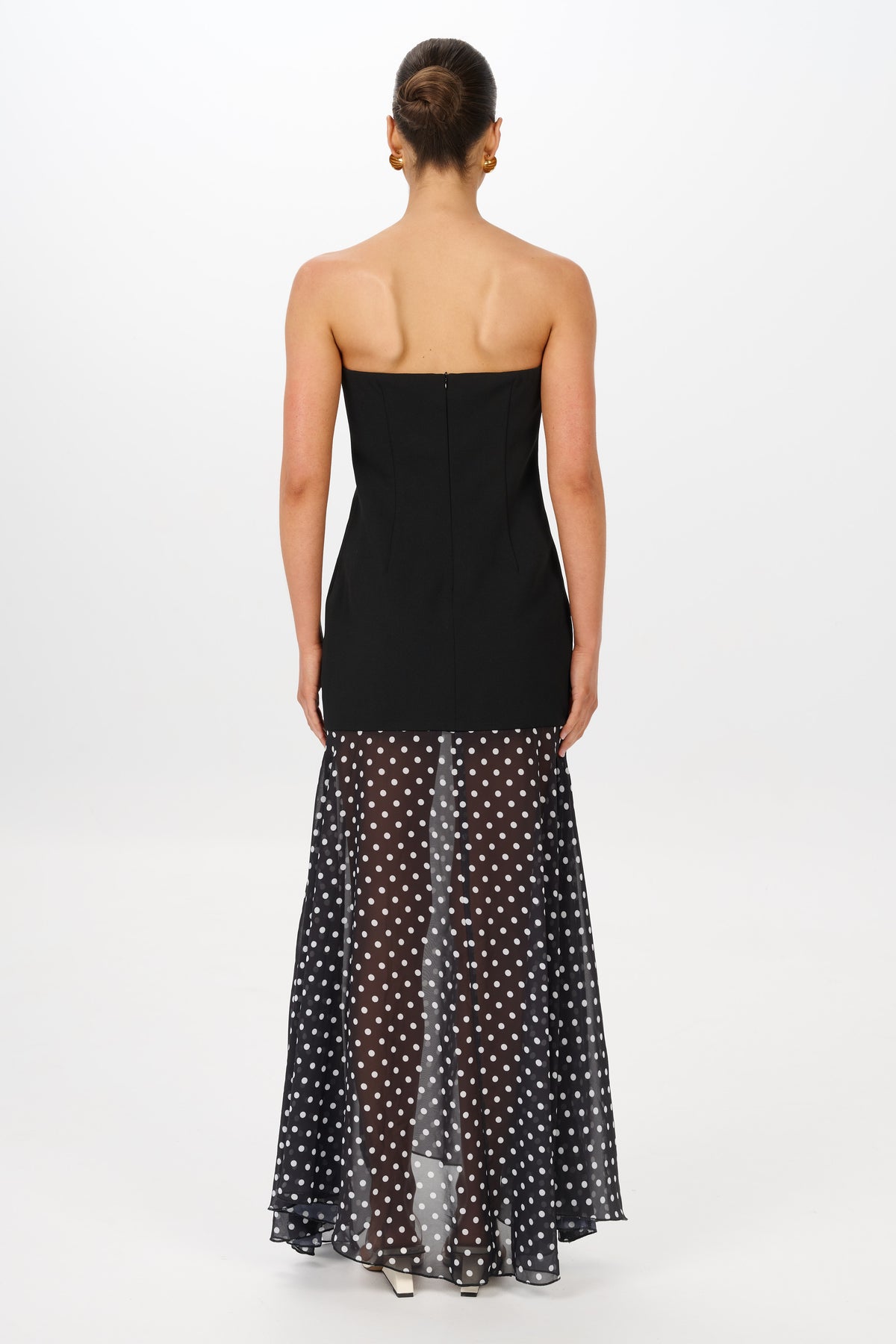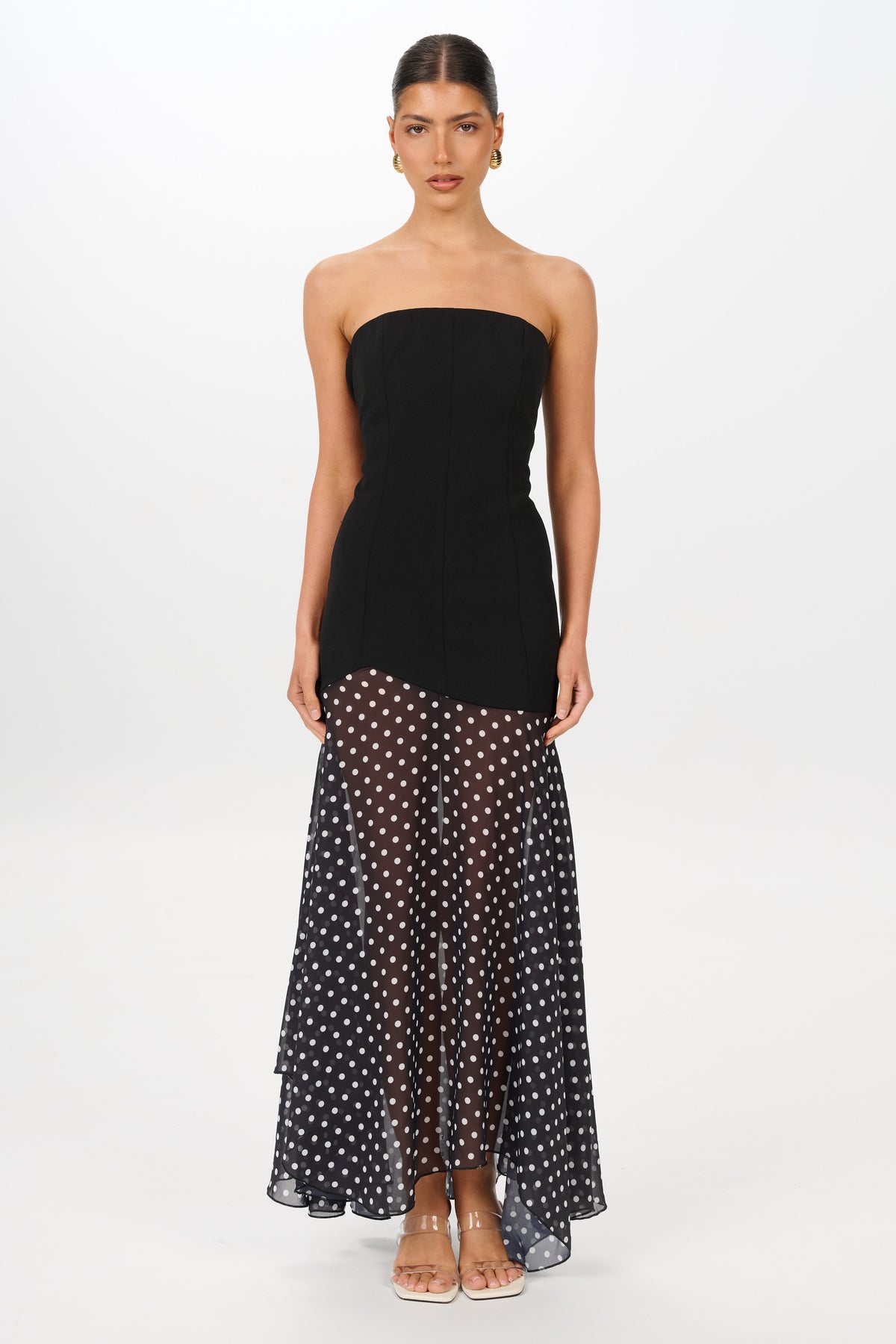 The Sarai Dress features a structured strapless bodice that contours the body before softening into a flowing, sheer polka-dot skirt. Designed to elongate the silhouette, its contrast of tailored lines and delicate movement creates an effortlessly elevated look.