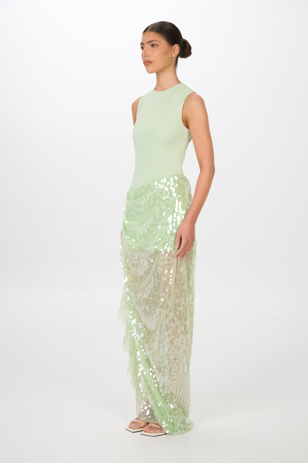 The ZOI Mini Dress embodies quiet confidence and unspoken glamour. Cut from a soft crepe that sculpts the upper body with precision, it flows into a beautifully sequined, draped skirt that catches every light with intention. The full back zip ensures a seamless fit — refined, sensual, and unapologetically powerful.