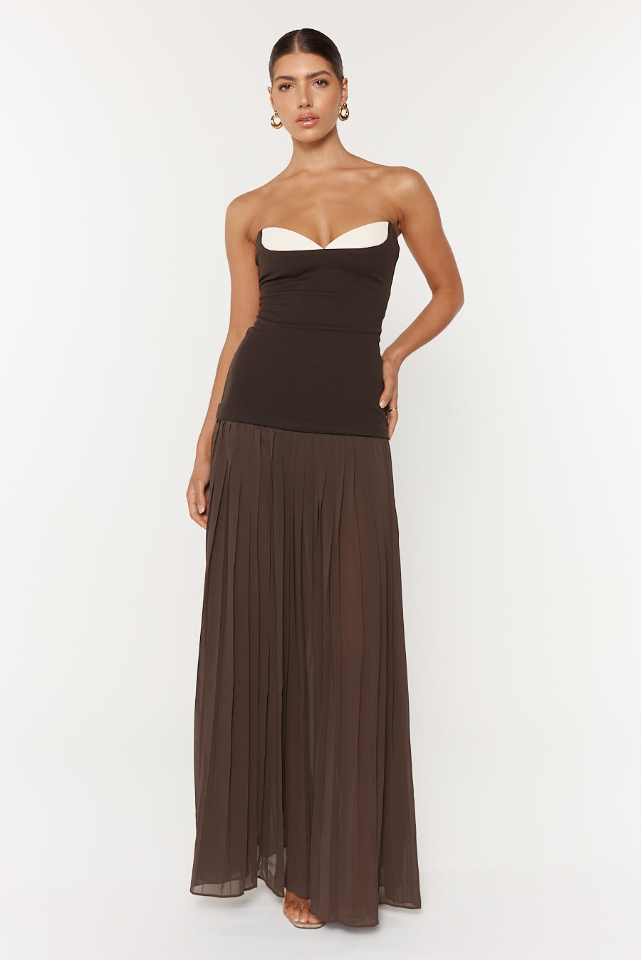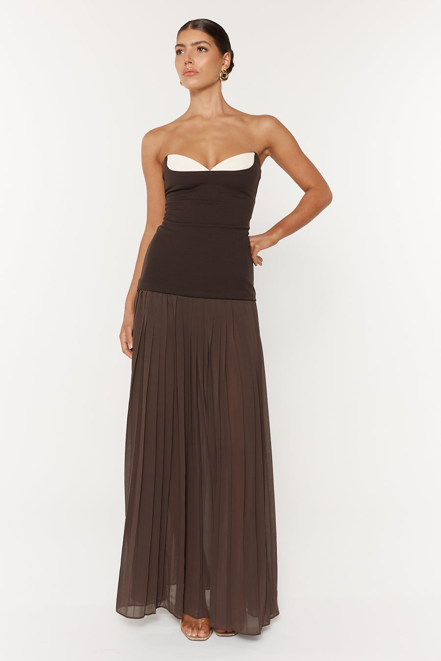 The Nicolette maxi dress, our best seller, showcases a stylish drop waist bodice that flows into a pleated fall skirt. Its gorgeous folded bodice design adds a touch of elegance and sophistication. Perfect for any occasion, this dress combines comfort with timeless beauty.